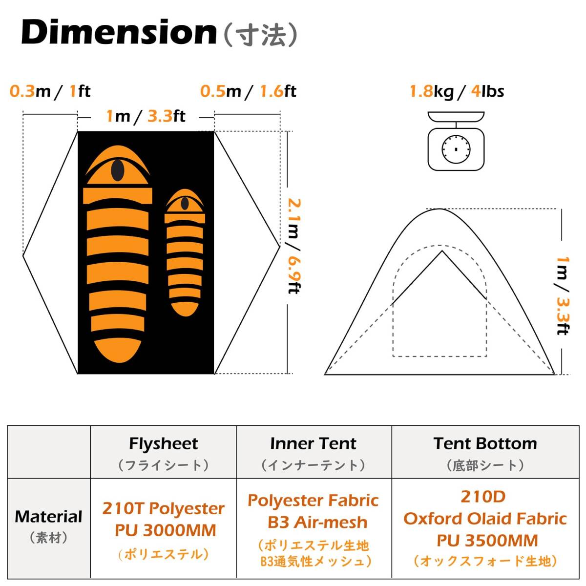 ?【底部シート】- 210Dオックスフォード生地を採用、PU防水コーティングを施し、耐水圧>3500mm。ソロン テントは防水性に優れた素材を採用し、雨の日でも快適に過ごせます。