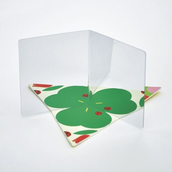 ●かがみは真ん中で2つ折りにできるシート状のもので、カードの角にかがみの角度をあわせて、映り込みを楽しみます。