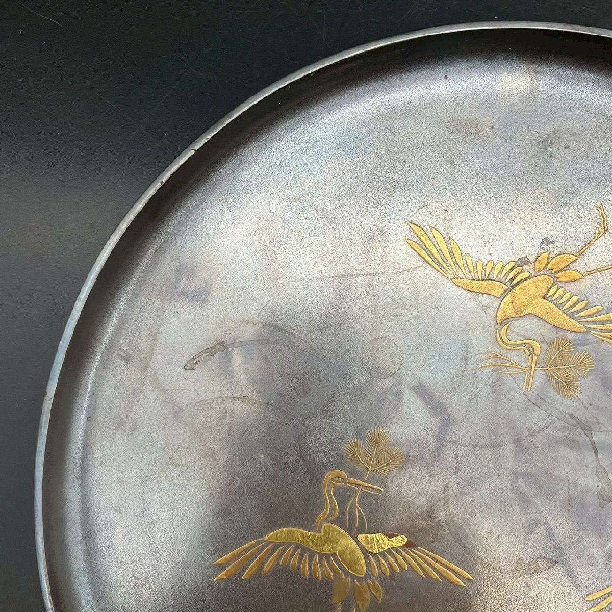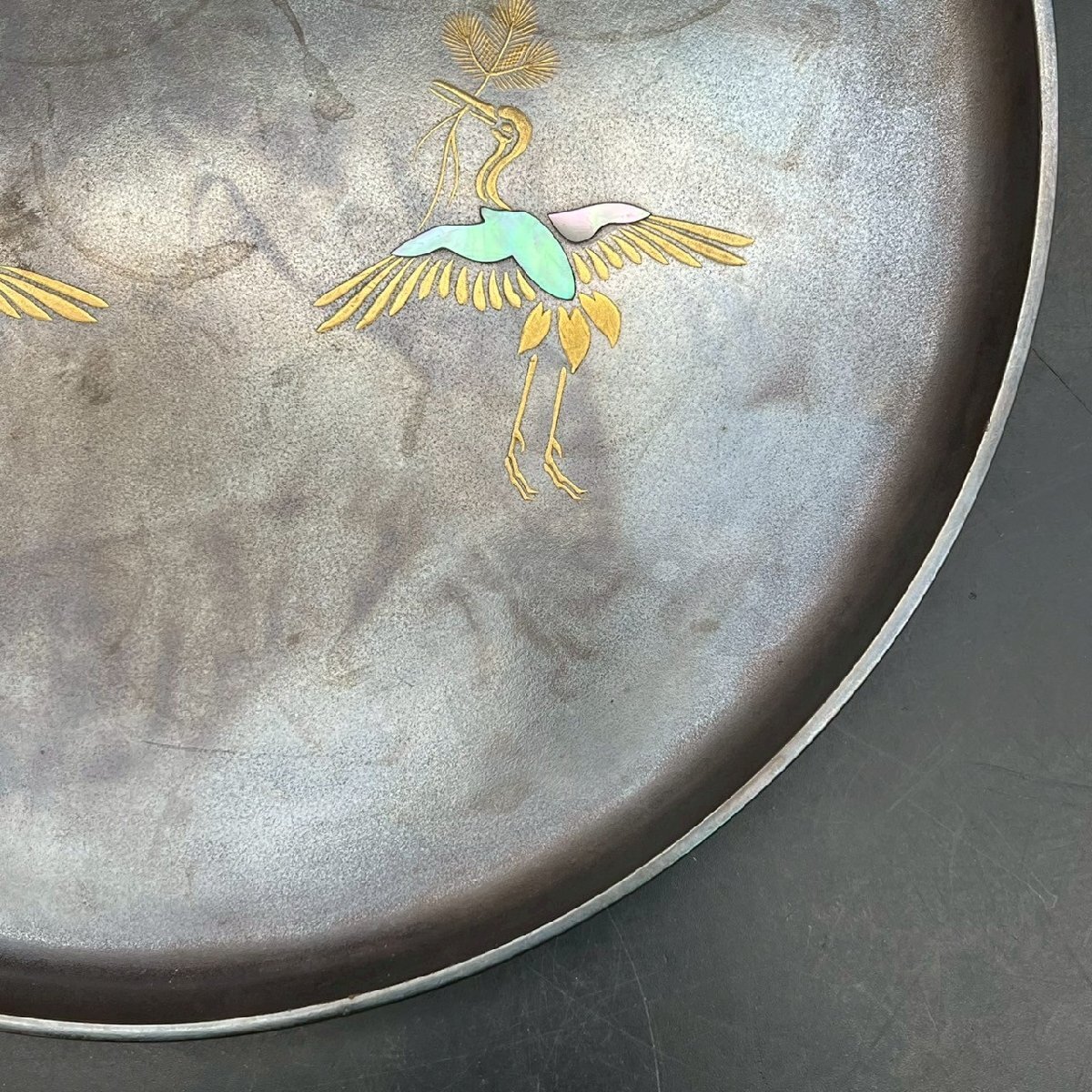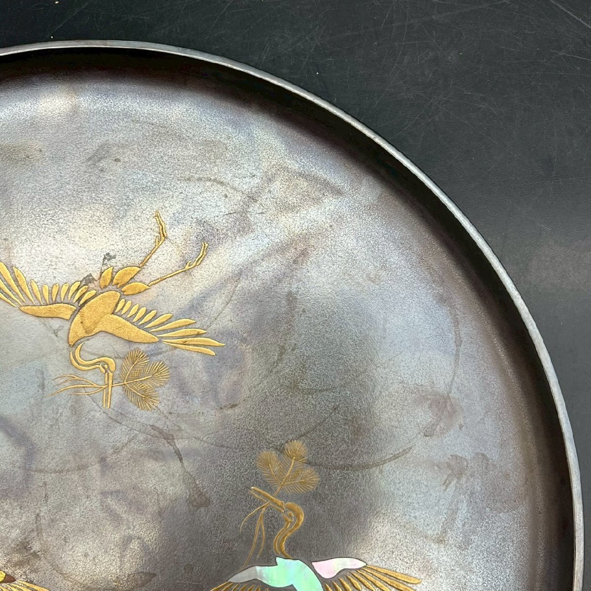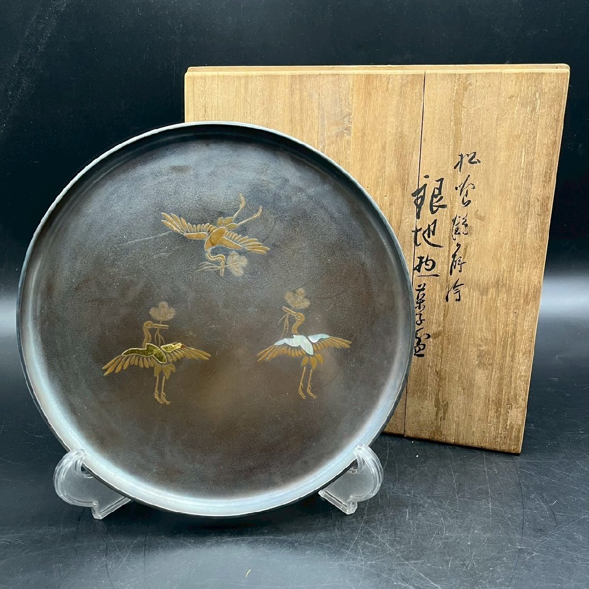 SW0603-3-3 らでん 蒔絵 食器 プレート 器 盆 銀地 松喰鶴 松鶴 骨董品 工芸品 伝統 菓子盆 共箱 インテリア 置物 直径25.5㎝ 80サイズ
