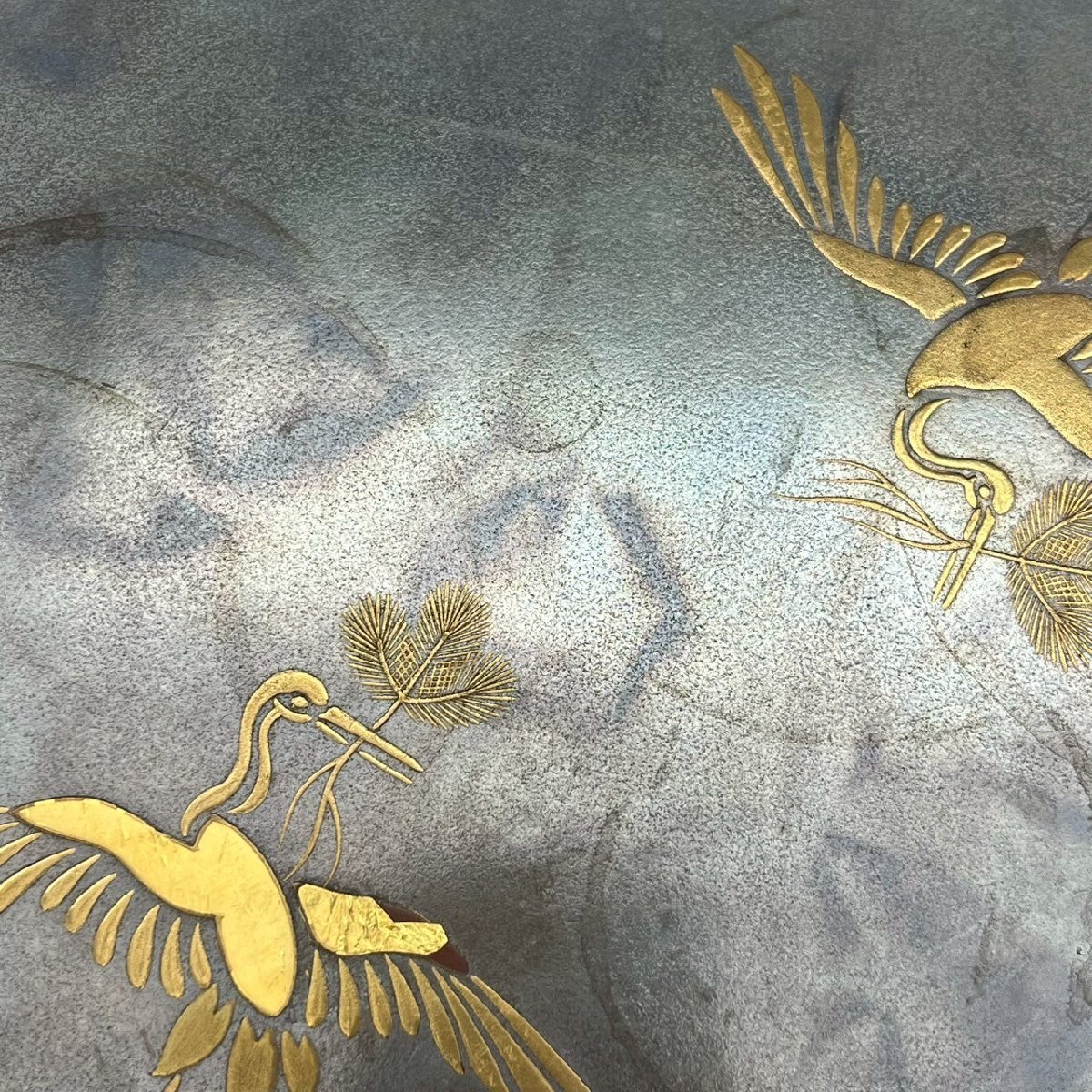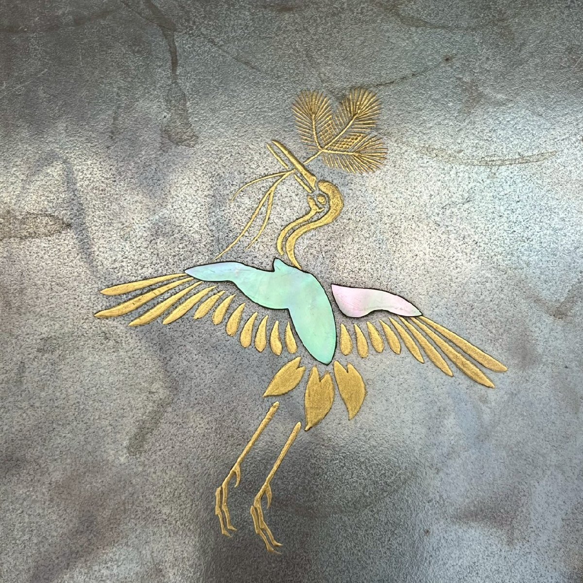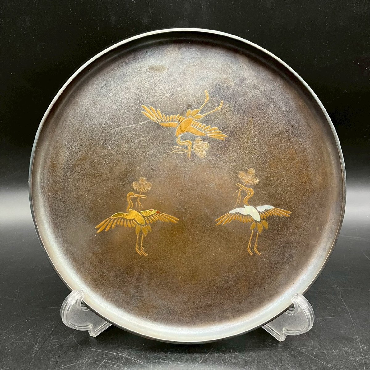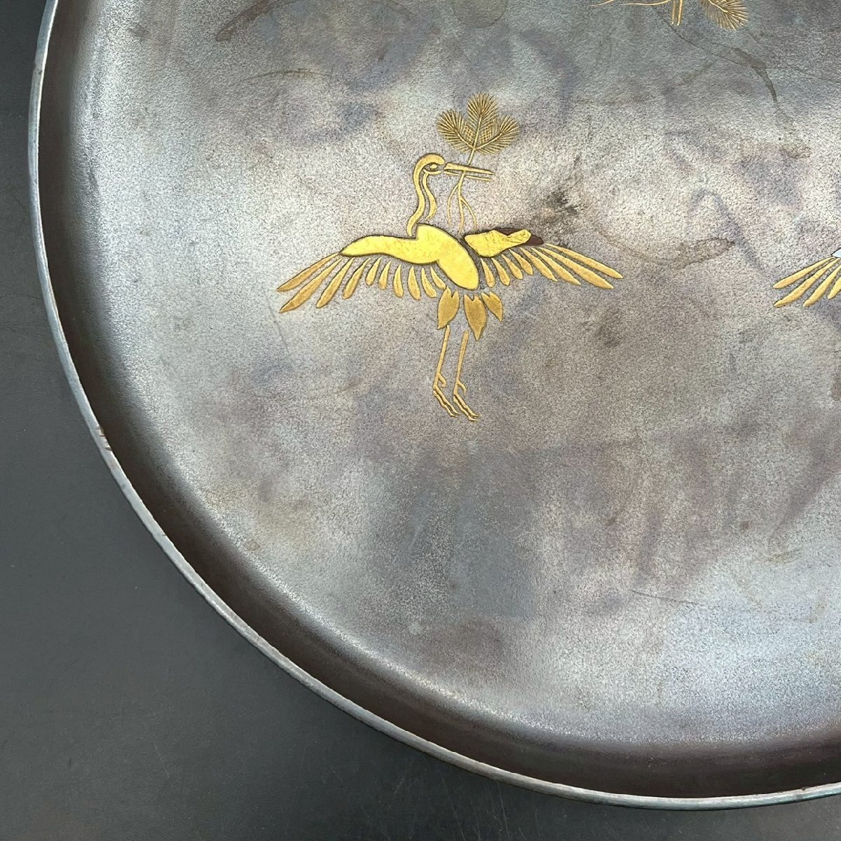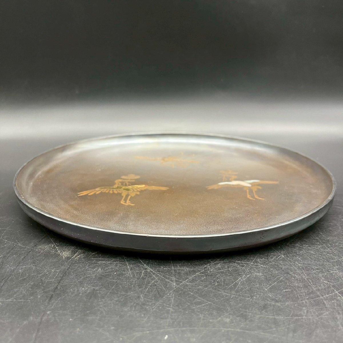 SW0603-3-3 らでん 蒔絵 食器 プレート 器 盆 銀地 松喰鶴 松鶴 骨董品 工芸品 伝統 菓子盆 共箱 インテリア 置物 直径25.5㎝ 80サイズ