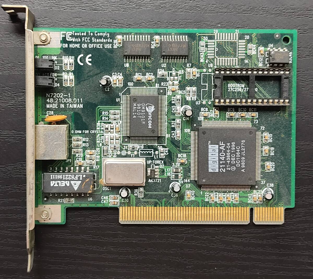 Digital Equipment Corporation(DEC)製の名チップ「21140-AF」を搭載した、PCI接続のEthernetネットワークカードです。10/100Mbpsの自動切替に対応し、Tulip系ドライバで広くサポートされているため、Linuxなどでも利用実績があります。