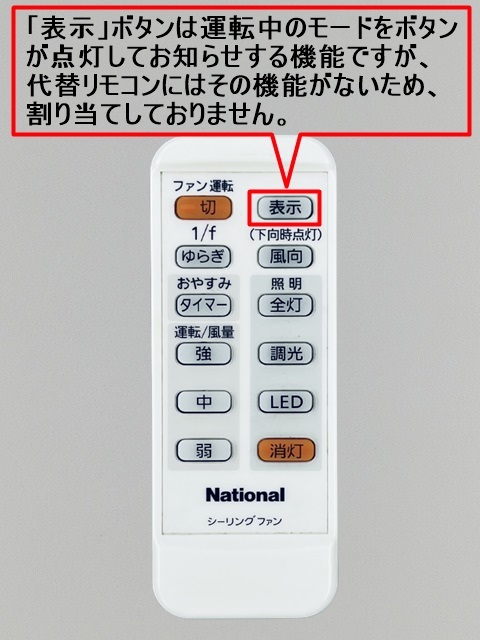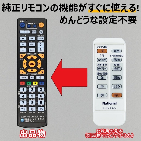 | 【商品名】 National SKP706001 代替リモコン 【対応機種】 SP7060用 比較画像の右側の純正リモコンが付属する機種に使用出来ます。 上記機種以外については、質問欄よりメーカーと型番をご連絡頂ければ、対応品のご案内をしております。 【商品について】 左側の代替リモコンが出品物になります。右側のリモコンは見本画像です。 タイトル機種のリモコン信号を入力した、設定不要で使える純正品と同等の代替リモコンです。 「表示」ボタンは運転中のモードをボタンが点灯してお知らせする機能ですが、 代替リモコンにはその機能がない為、割り当てしておりません。 乾電池は付属しません。別途ご用意下さい。(単4乾電池×2本) 【商品サイズ】 縦18.5cm×横5cm×高さ2.35cm 【発送について】送料無料 迅速発送を心掛けております。土日祝日はお時間を頂く場合ございます。 ポスト投函配達となり、日時指定は出来ません。 | ||