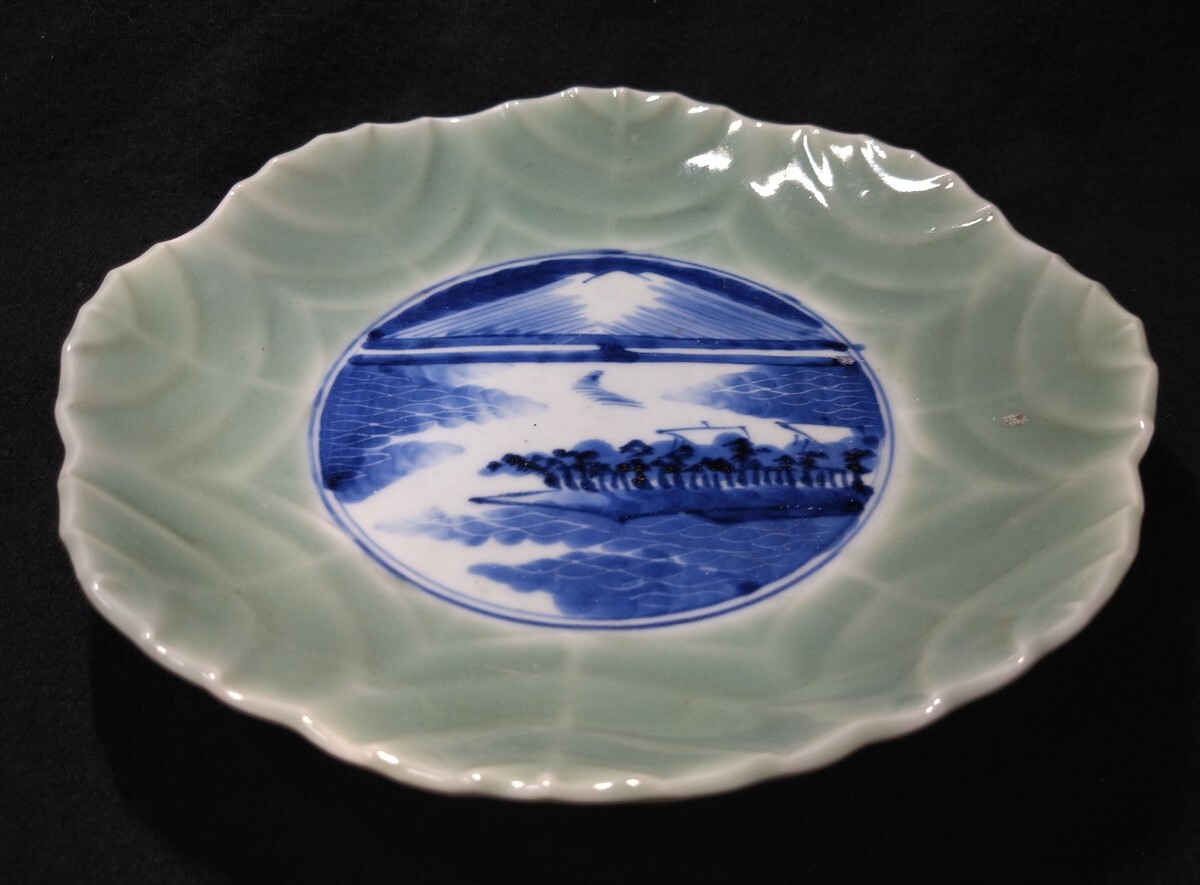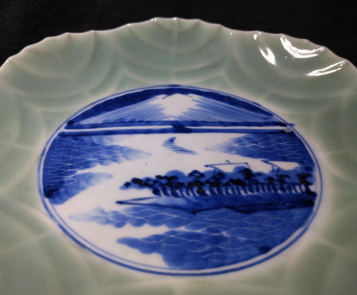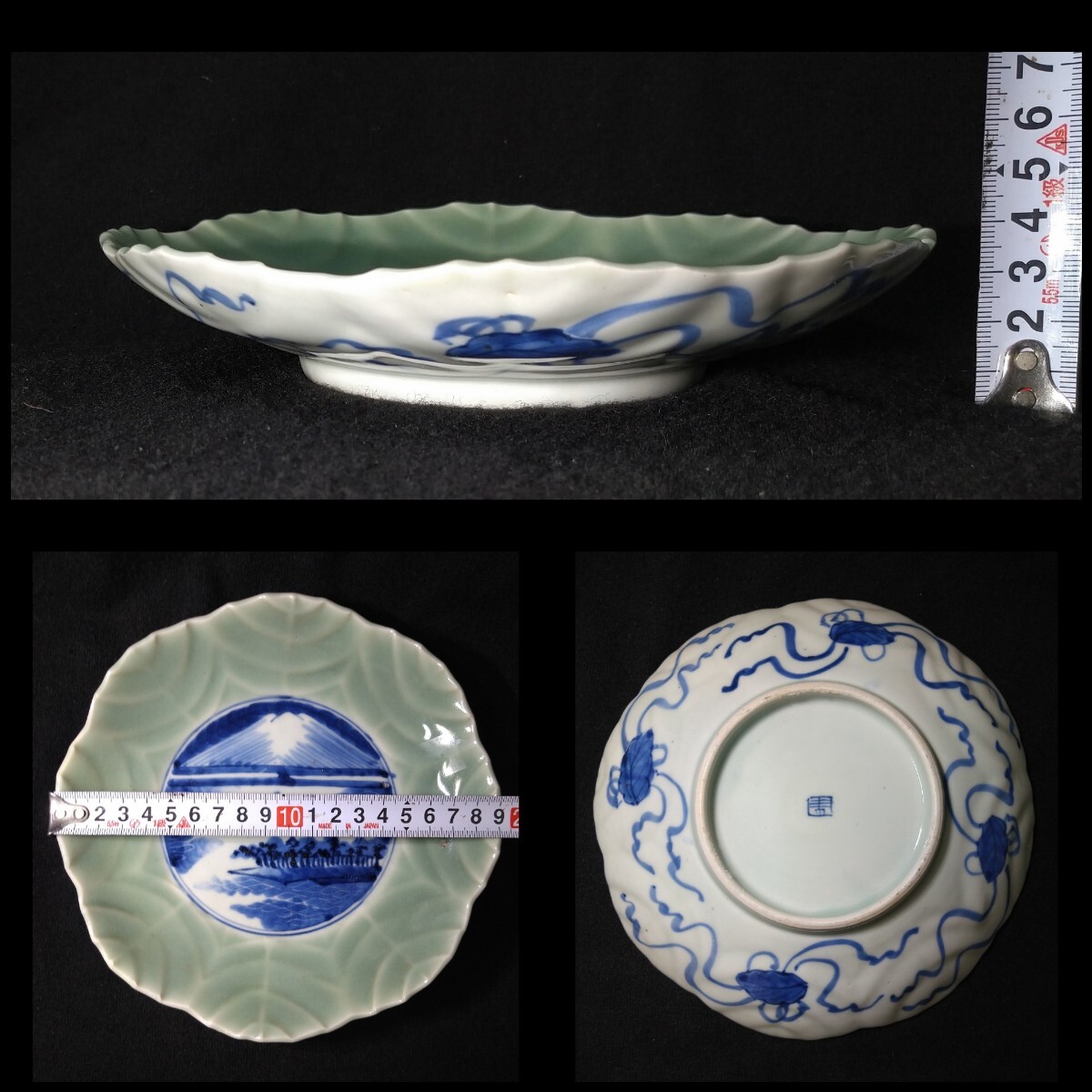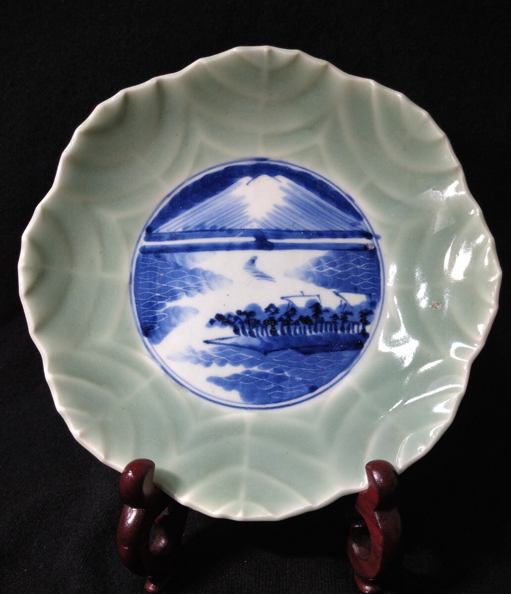 葉脈の陰影に富士山の染付が映える美しい中皿でございます。素人採寸で申し訳ございませんが、径19.5cm、高さ3.7cmでございます。