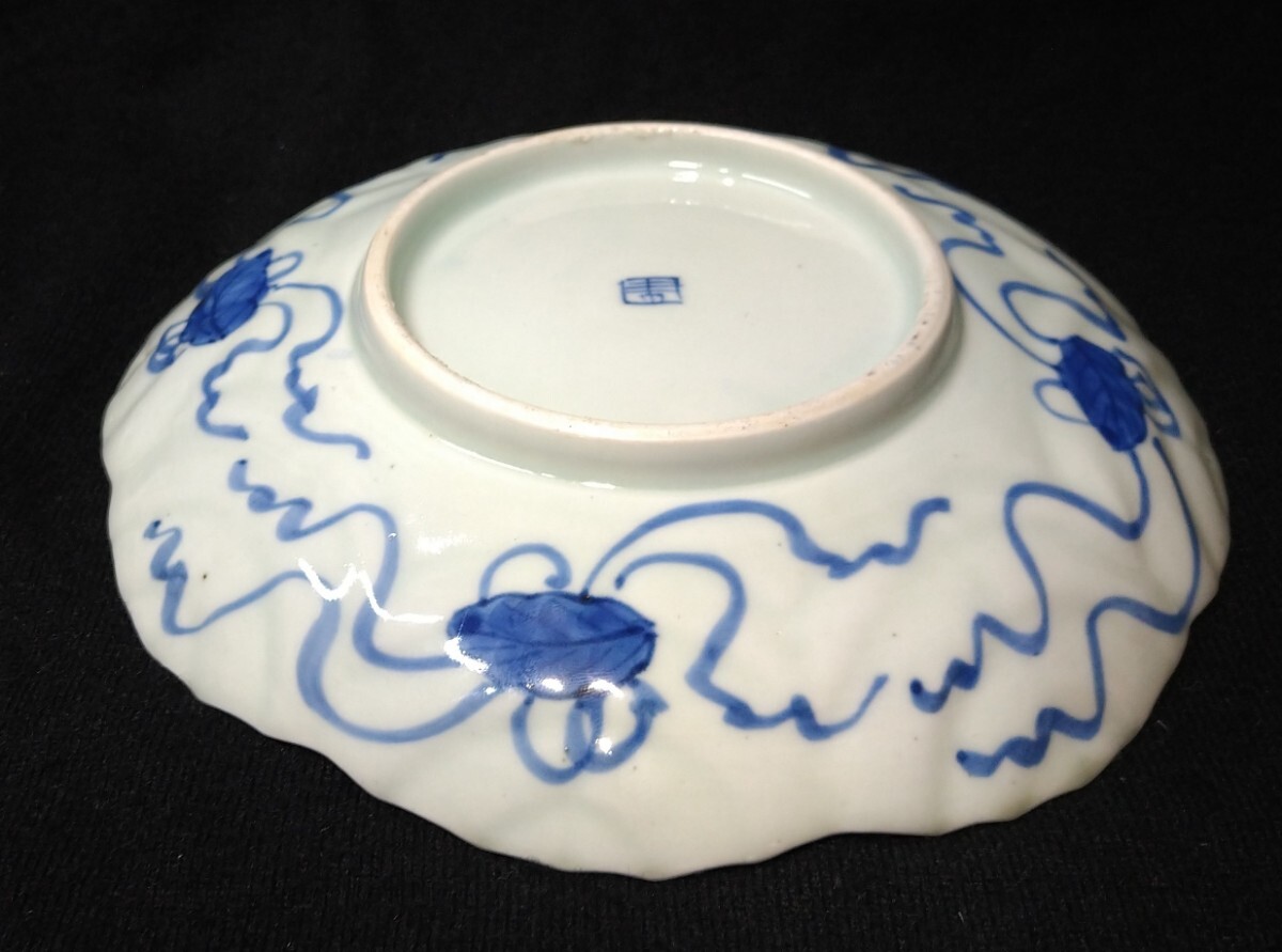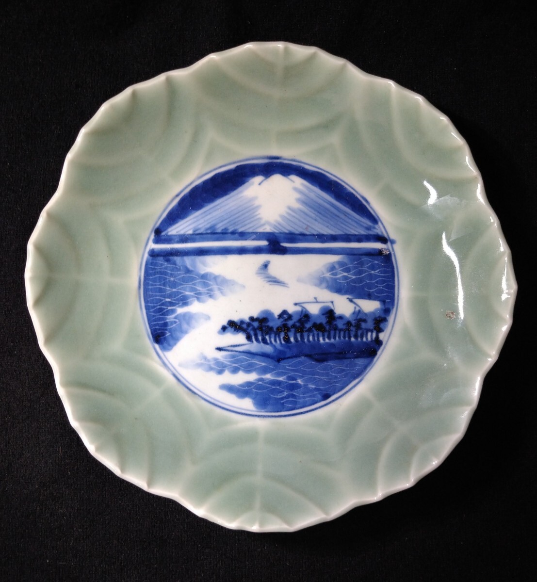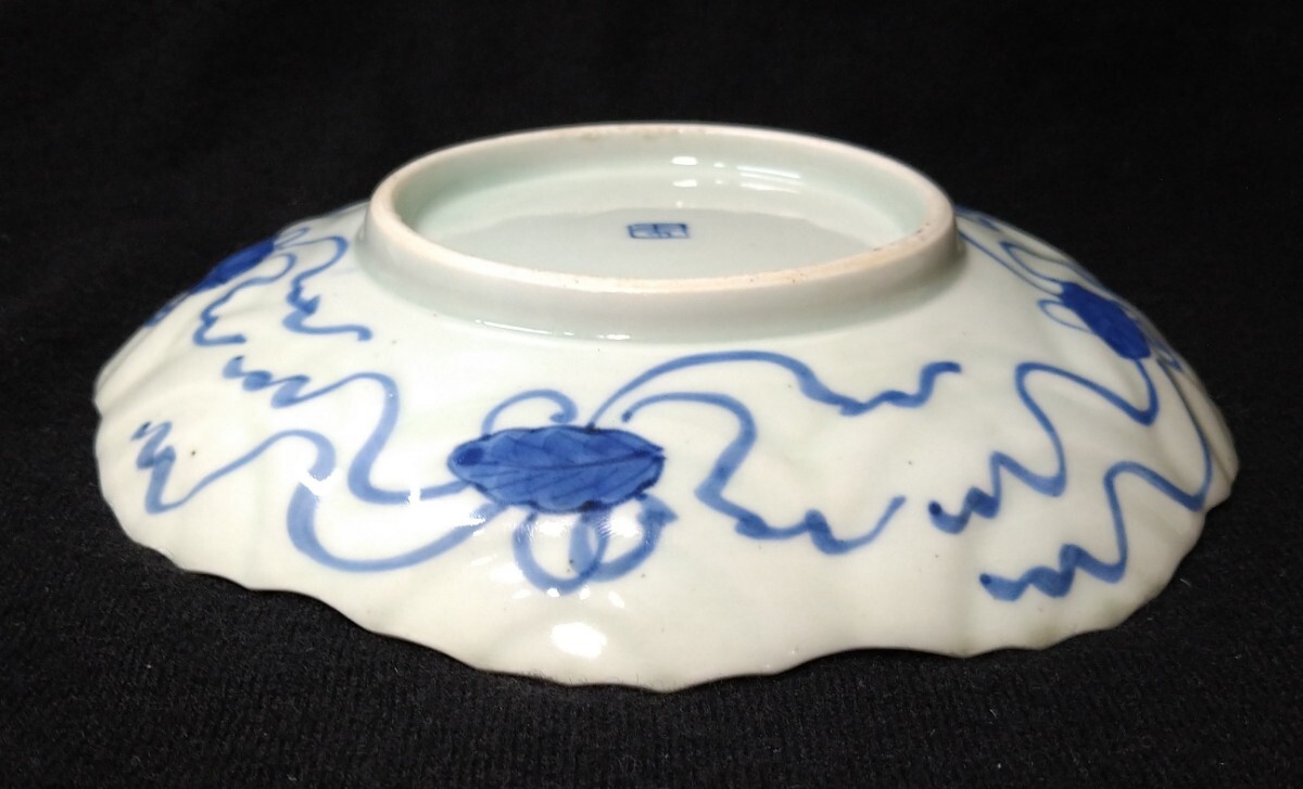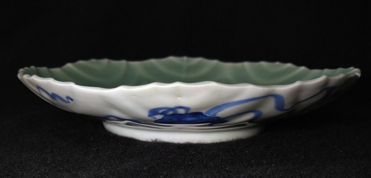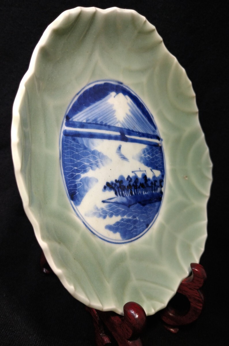 葉脈の陰影に富士山の染付が映える美しい中皿でございます。素人採寸で申し訳ございませんが、径19.5cm、高さ3.7cmでございます。