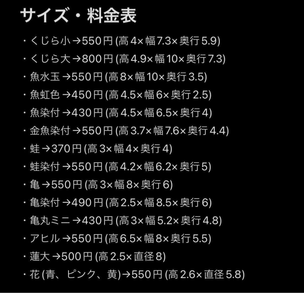 サイズは写真の「サイズ・料金表」をご参照下さい。