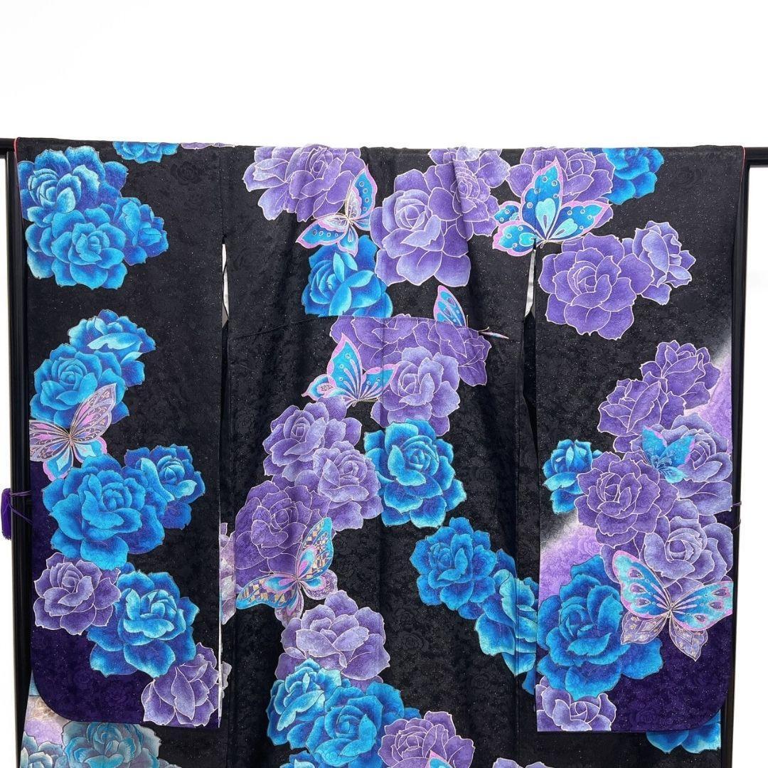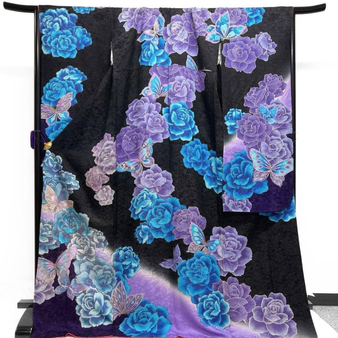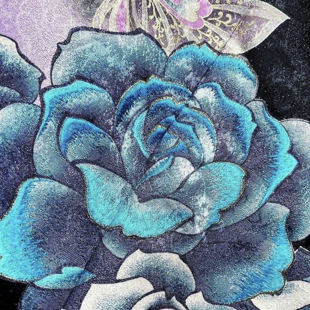 寒色を基調とした薔薇や蝶が鮮やかに描かれた一着です。