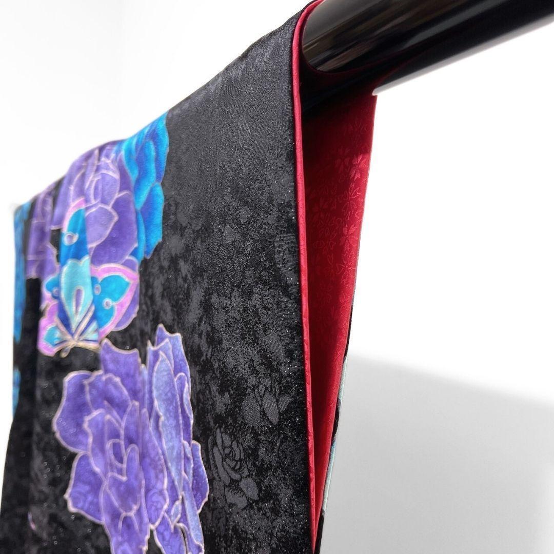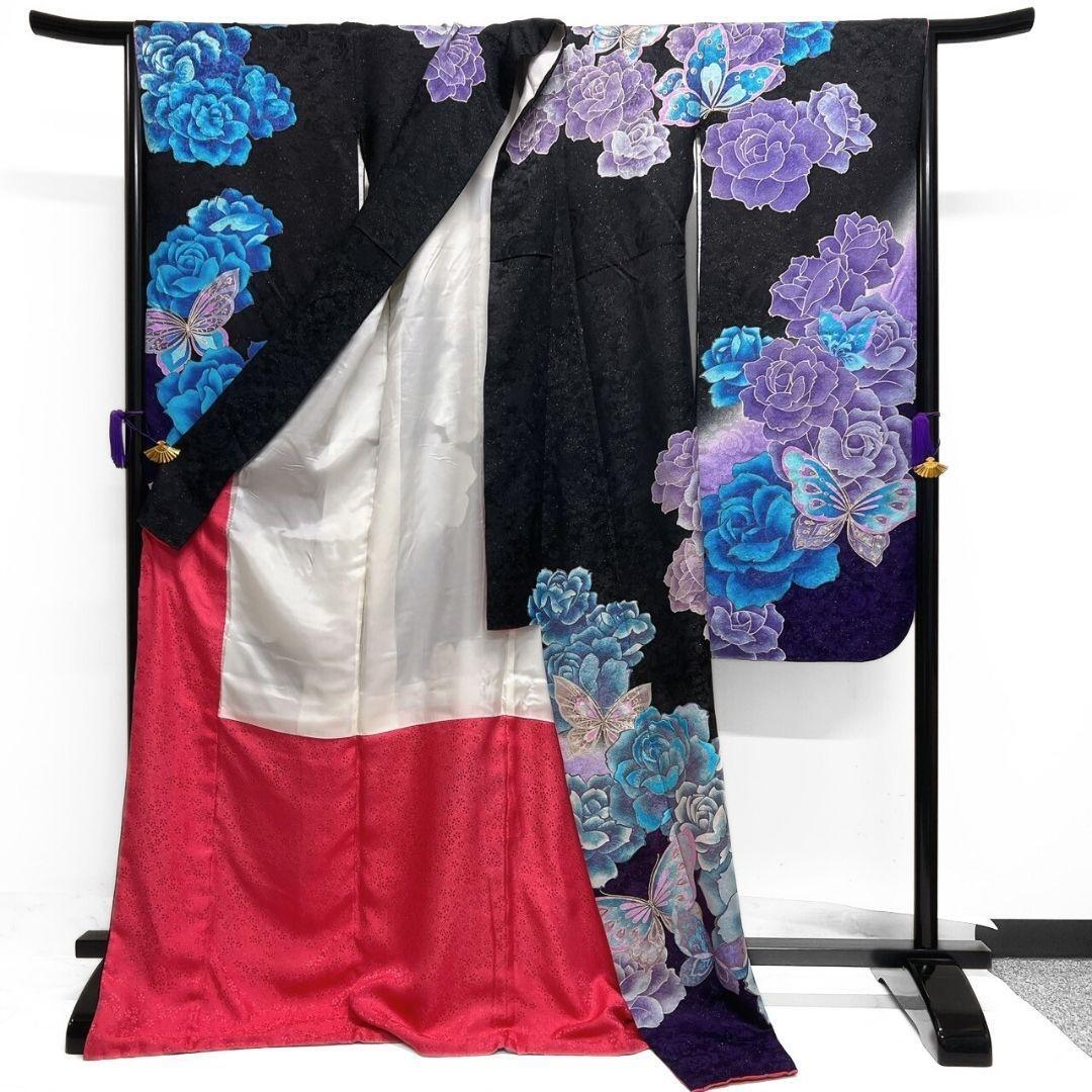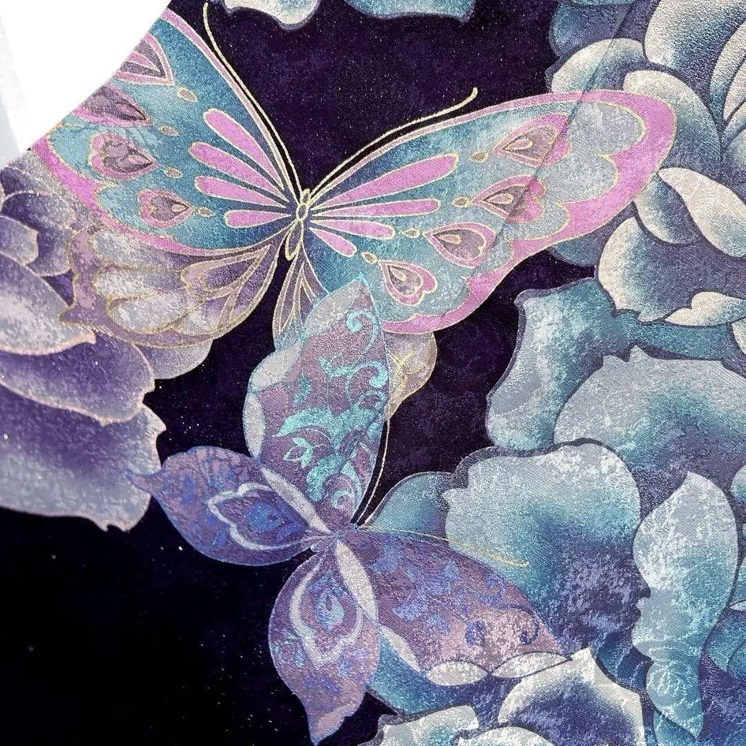 寒色を基調とした薔薇や蝶が鮮やかに描かれた一着です。