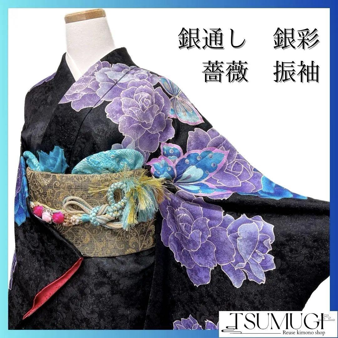 銀通し 銀彩 薔薇 蝶 青バラ 振袖 成人式 晴れの日 着物 032a p