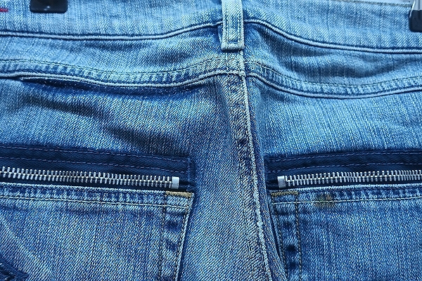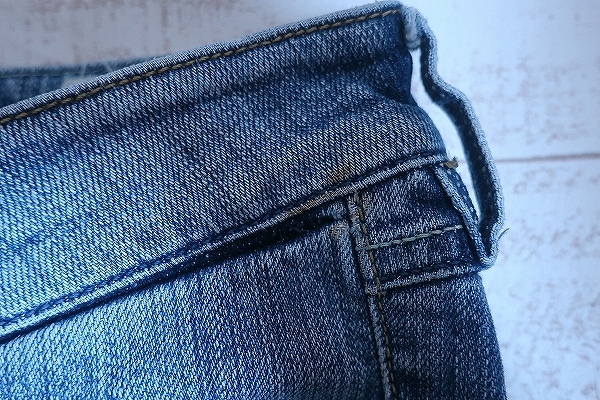 コインポケットに色褪せ、バック右ポケットと右腿の一部に色移り、