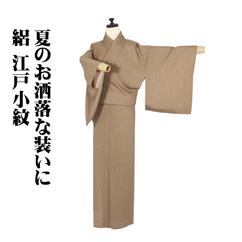 | 色・柄 | 絽 江戸小紋 丹後縮緬地 鮫地模様地 緑(お召茶色)・茶色(榛色)地 青海波・短冊文 上品な着物です。 (写真では上手く色が出ない場合があります。ご了承下さい) |