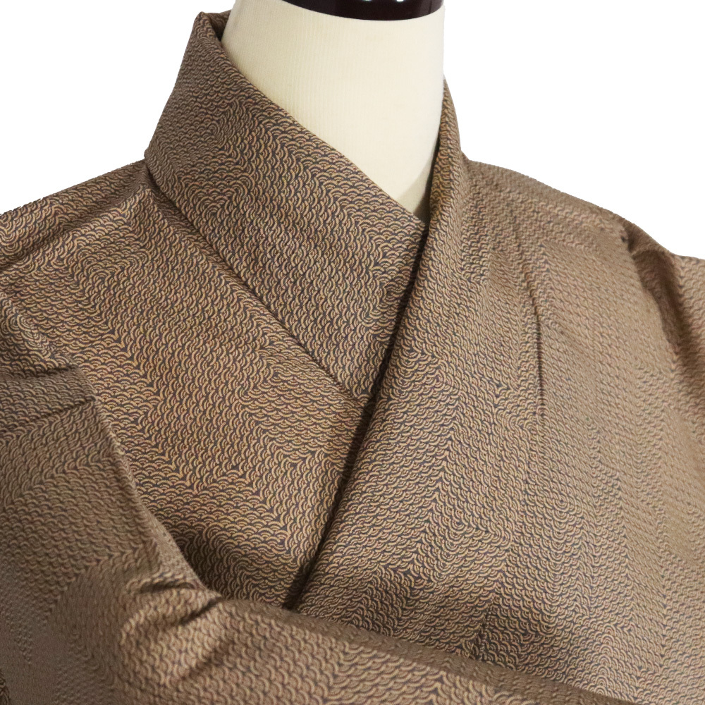 | 絽 江戸小紋 丹後縮緬地 鮫地模様地 緑(お召茶色)・茶色(榛色)地 青海波・短冊文 164 広襟 | |