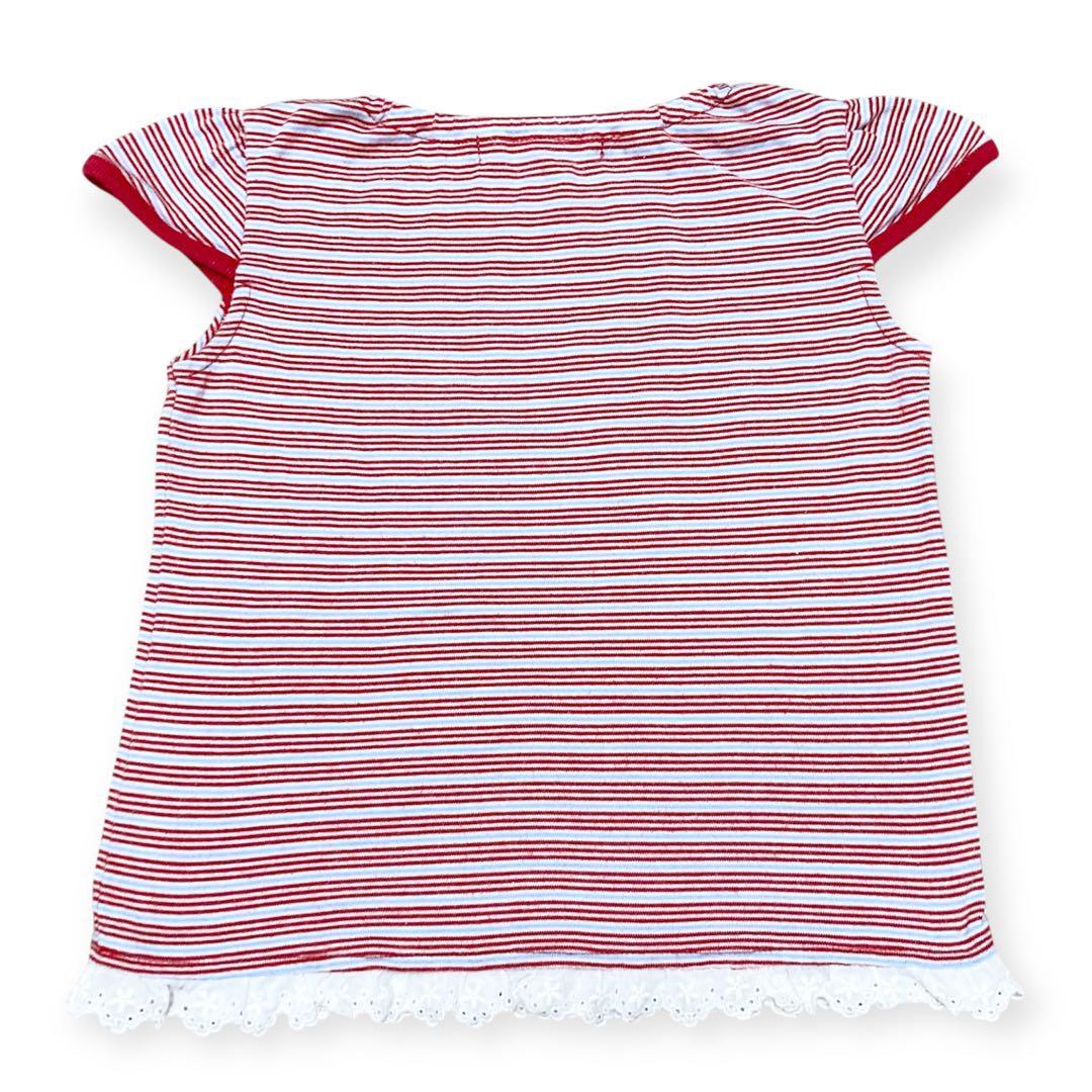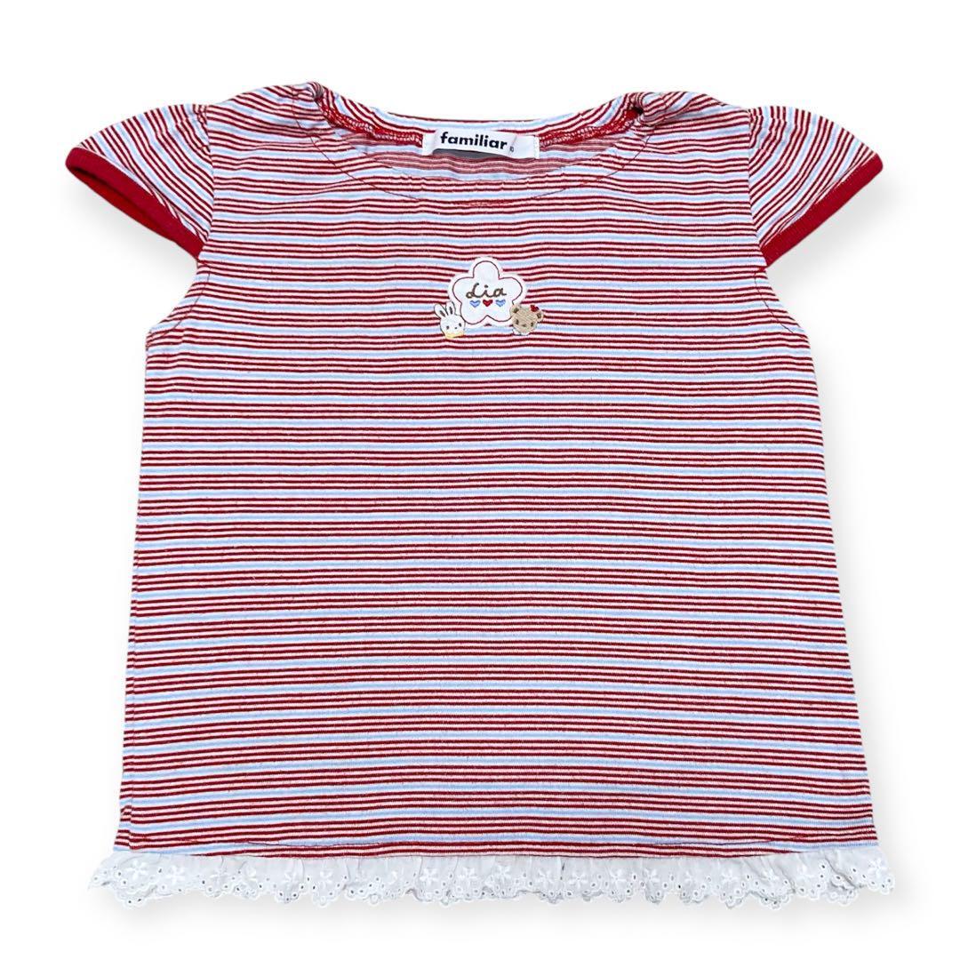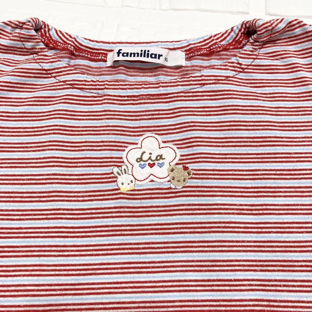 ベビー服familiarのとても可愛いくま柄の半袖トップスです。胸元にりあちゃんの刺繍があります。裾にレースが付いているのもかわいいです。女の子用です。