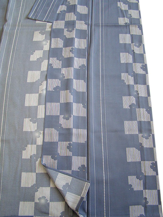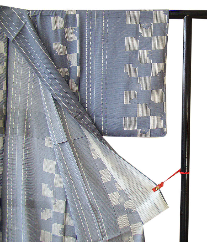商品説明 | こちらのお品は夏物でございますので、7月~8月にお召頂ければと思います。 「絽」と言えば、紗と双璧を成す夏のお着物の生地で その最大の魅力は絶妙の透かし加減でございます。 清涼感溢れる地の風を通すしなやかさは夏に着物を着るという贅沢を 快適に愉しませてくれることでしょう。 着物には、大きく分けて「袷(あわせ)の着物」と「単衣(ひとえ)の着物」と「夏着物」があります。 反物(表地)を着物に仕立てるときに、裏地類をつけるものを袷の着物、 つけないものを単衣の着物と呼び、胴裏や八掛といった裏地がつかない一枚ものの着物です。 また裏地がないため、座る時などにヒップのラインが目立たないよう、 居敷当て(いしきあて)の生地をつけることもあります。 居敷当ては付いておりません。 とてもしなやかなさらっとした肌触りが極上の着心地を誘う滑らかな上質な「駒絽」の生地、 藍鼠色地に市松に細縞、花柄の染柄が洒落感に満ちた粋な着物姿を演出しております。 |