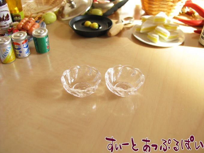 プラスチック製のうつわ2枚セットです。透明で、サラダなんかを盛り付けるのにぴったり!な感じです。貴方のミニチュアフード作りに、ぜひお役立てくださいませ!直径15ミリ、高さ7ミリ