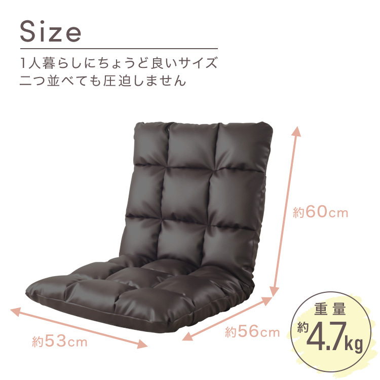 | 1人暮らしにもちょうど良いコンパクトサイズ! ウレタンたっぷりのフカフカした座面! まるで包み込まれるような座り心地です♪ 大事な内部ギアは、世界でも活躍する実績ある日本メーカー「KoYo」の日本製! シンプルな14段階リクライニングで、曲げて、伸ばして、広げて・・・くつろぎ方、選び放題です♪ 2種類の生地素材&カラーから選べます! ファブリック生地:通気性が良く、サラッとした肌触りが心地いい レザー生地:リアルレザーの風合いがあり高級感がある 【商品詳細】 カラー ・レザー:ブラック、ダークブラウン ・ファブリック生地:ブラウン、ネイビー 素材 ・レザー:PU、ウレタンスポンジ、鋼管 ・ファブリック:麻リネン布、ウレタンスポンジ、鋼管 サイズ :(約)幅53x奥行56x高さ60cm 座面厚み:(約)11cm 収納サイズ:(約)幅55x奥行55x高さ23cm 重量 :(約)4.7kg |