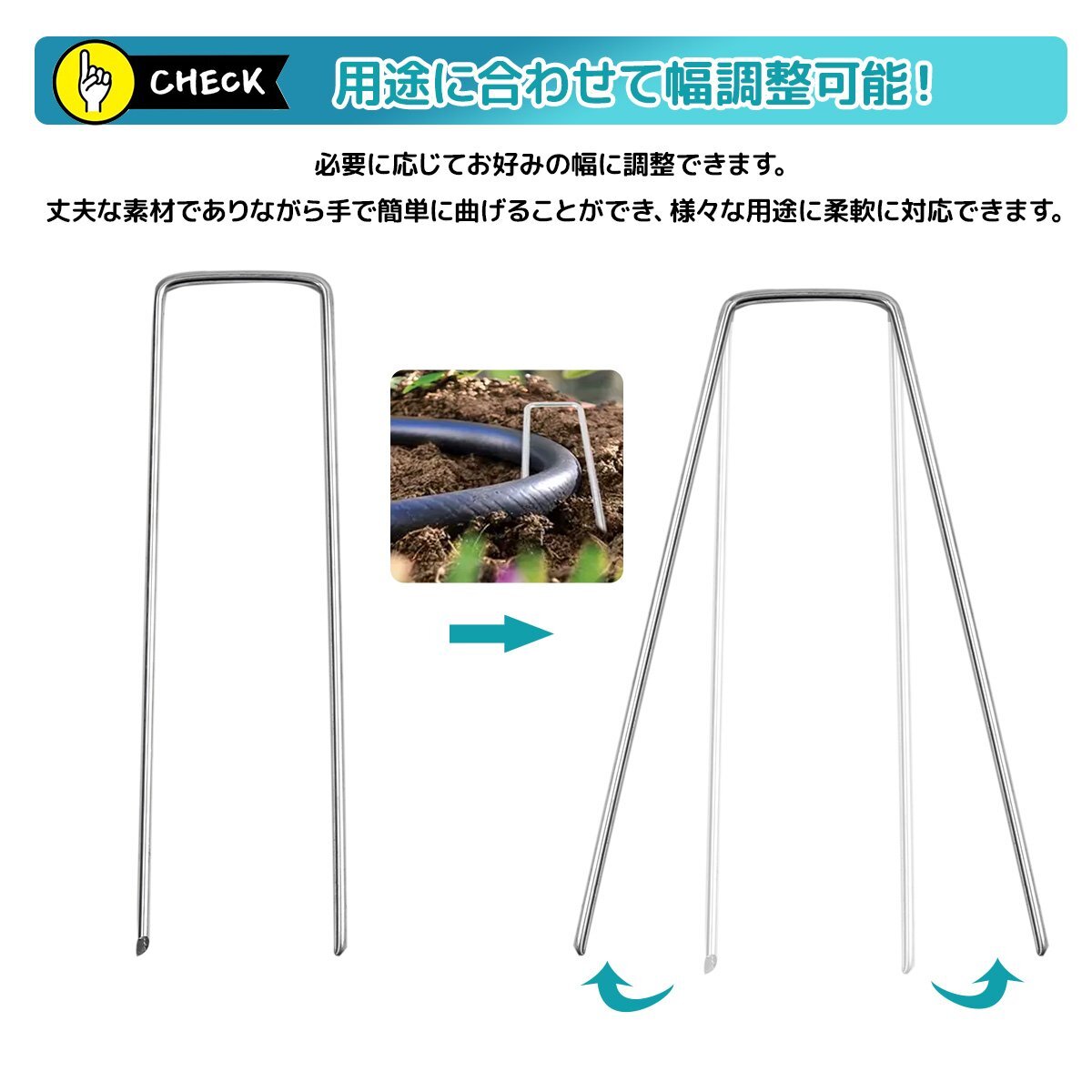 ピンは手で簡単に曲げることができ、使用シーンに合わせて幅の調整が可能。防草シート、人工芝、防虫ネット、ビニールマルチ、不織布など様々な用途に対応します。