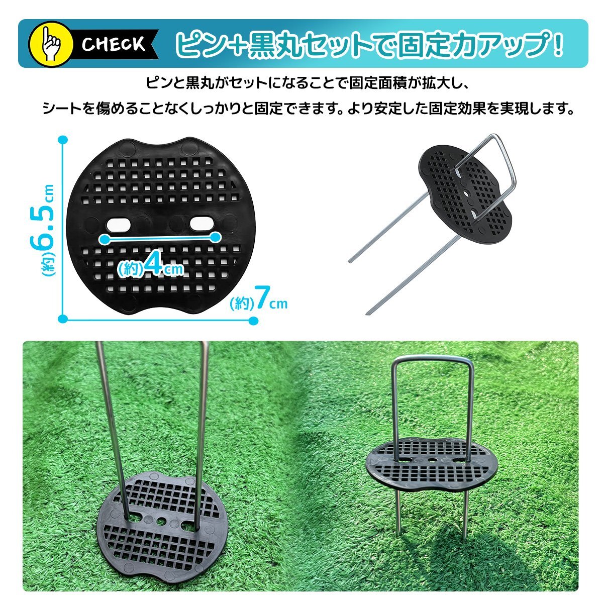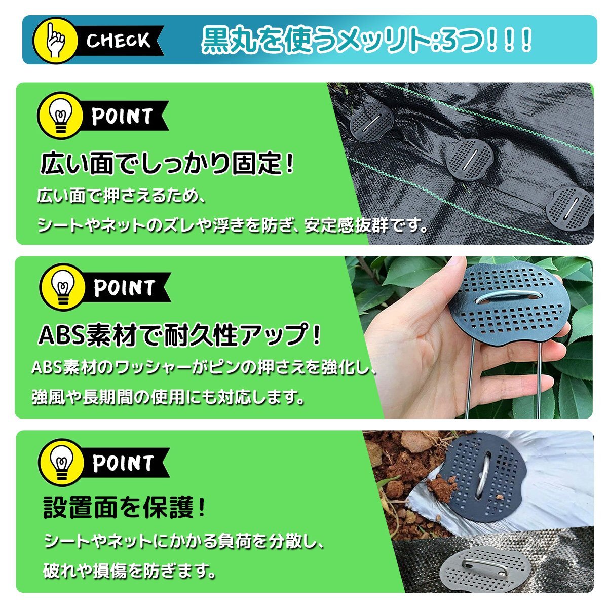 黒丸ワッシャーが付属しているため、従来のピンと違いシートにかかる負荷を分散し、穴あきや破れを防止。防草シートやネットを傷めず長期間しっかり固定できます。