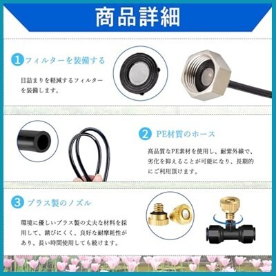 • 【様々な用途に】植物灌漑、野菜庭、芝生ミスト、冷却システム、冷却システム、塵の除去、ミストシャワー、ガーデン加湿できます。