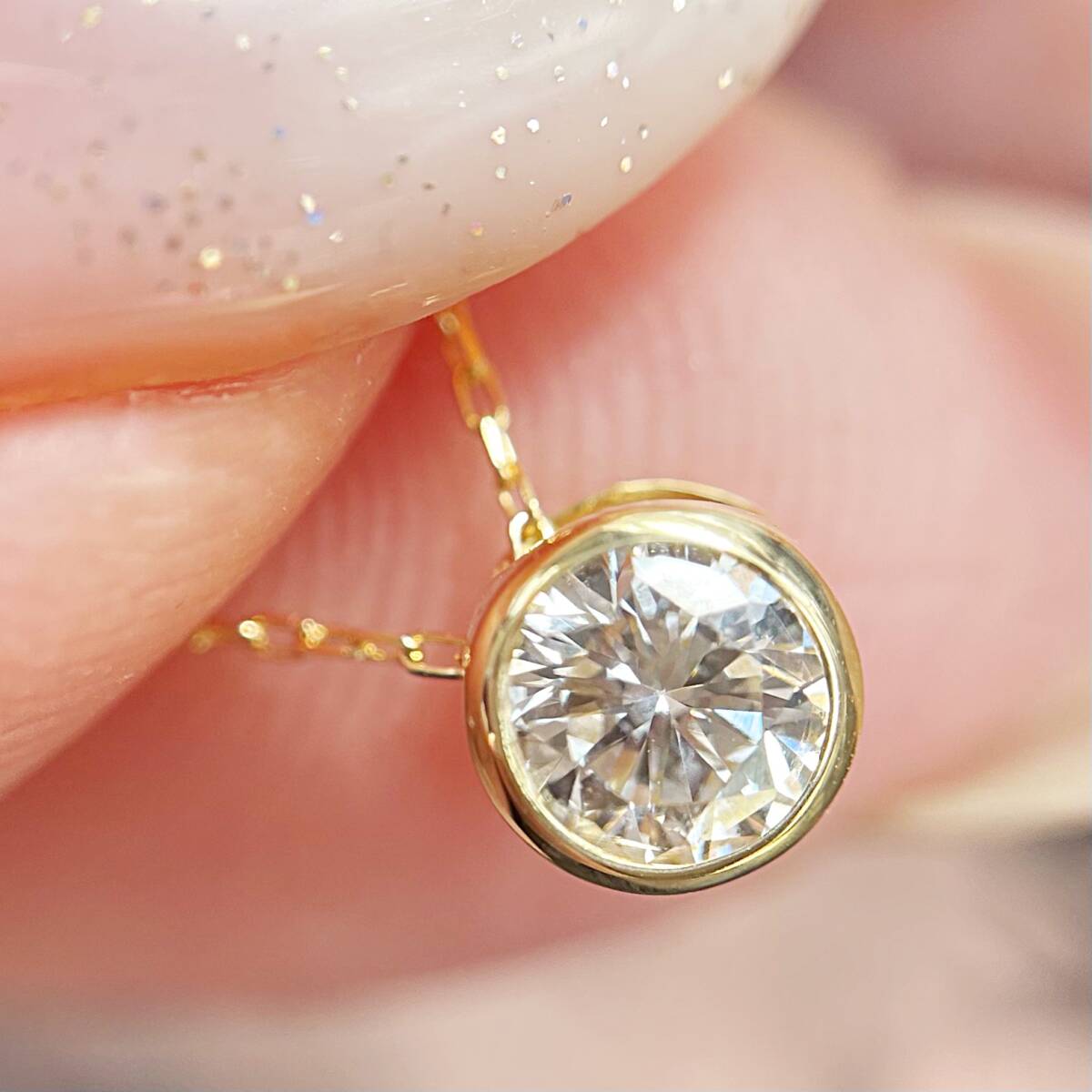一般的な爪留め式に比べ爪がない分、ダイヤモンドが少々大きく見えます。