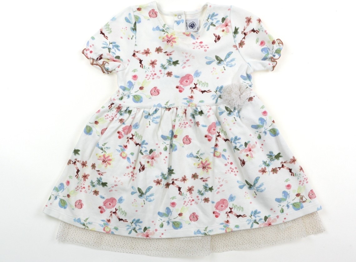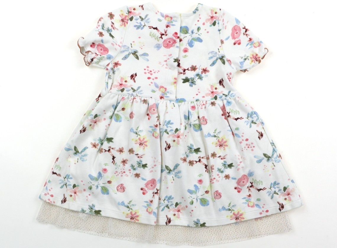 実際のサイズ表記は86cm。綿の鹿の子生地で、スカートはチュールとカットソー地の裏地2枚付き。襟元と胸に5cmほどの黄色いシミがあり、お腹とスカート前身頃に、茶色いシミが数か所あります。まだまだ普段着として活躍してくれそうです。