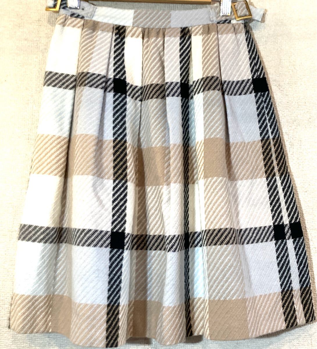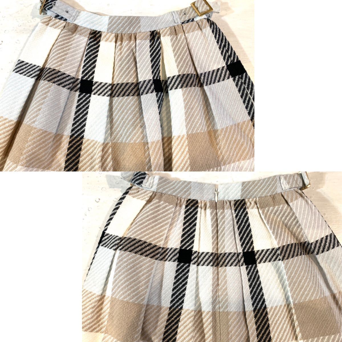 ベージュカラー、ライトブルー、ブラウンカラー、ブラックカラーで大柄のチェックパターンがデザインされたスカートで、カラーリングの綺麗なデザインになっています。