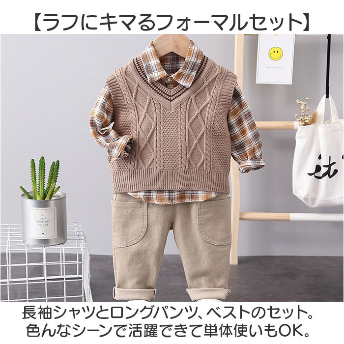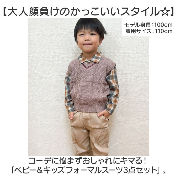 | 商品説明 | ・・【大人顔負けのかっこいいスタイル☆】 ・コーデに悩まずおしゃれにキマる!「ベビー&キッズフォーマルスーツ3点セット」。 ・【ラフにキマるフォーマルセット】 ・長袖シャツとロングパンツ、ベストのセット。色んなシーンで活躍できて単体使いもOK。 ・【カジュアルなチェックシャツ】 ・フロントボタン付きの、スタンダードなカタチ。やや起毛感があり、胸にはポケットを配置。 ・【ストレスなく履けるロングパンツ】 ・締めつけ感の少ないゴム仕様で、着脱がスムーズ。上下左右にポケット付き。 ・【アクセント使いできるベスト】 ・スタイリッシュな雰囲気を演出する、ニットベスト。程よいきちんと感もプラス。 ・【特別な日にとっておきの1着を】 ・軽やかで、小さなお子さまも着用しやすい!発表会や誕生日などのイベントにおすすめ☆ |