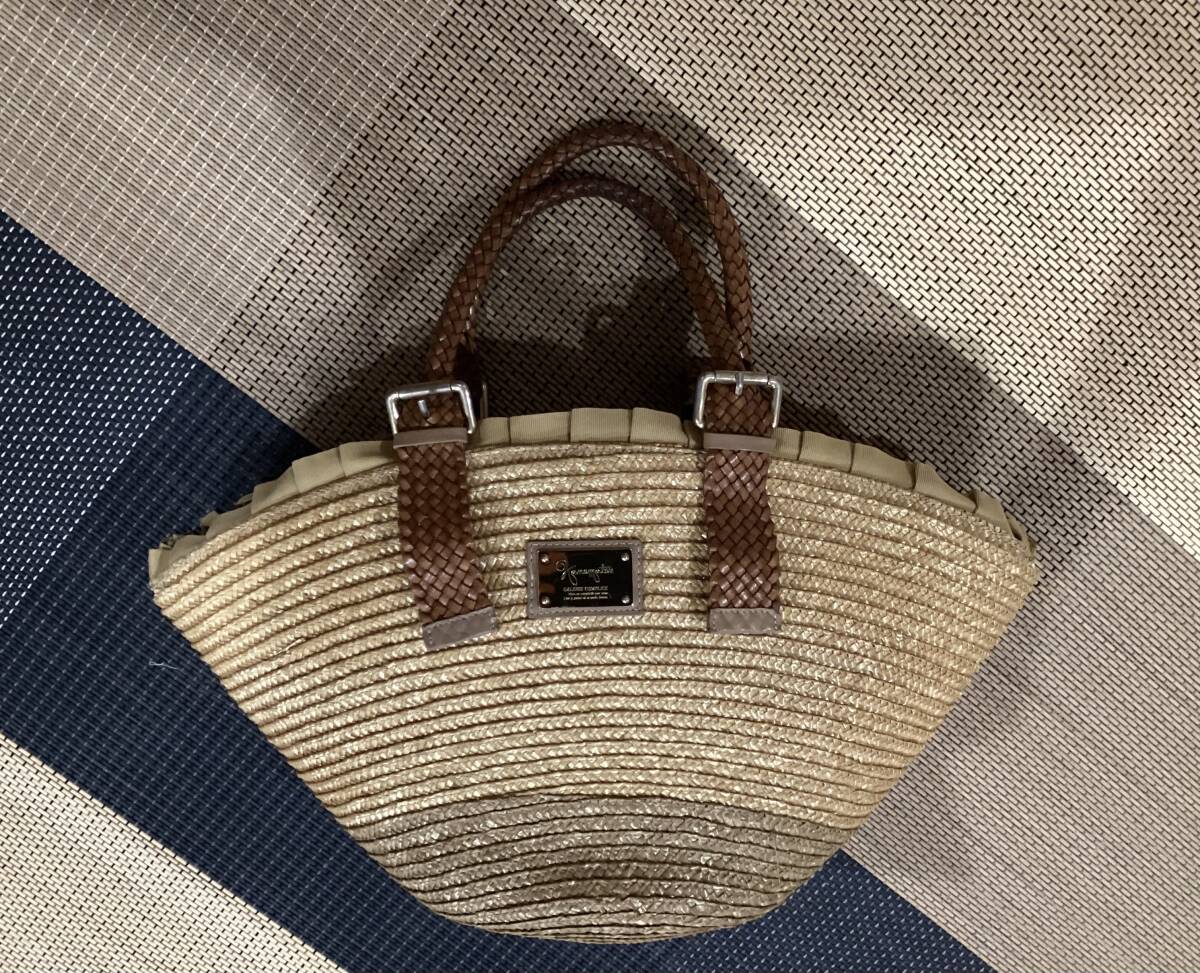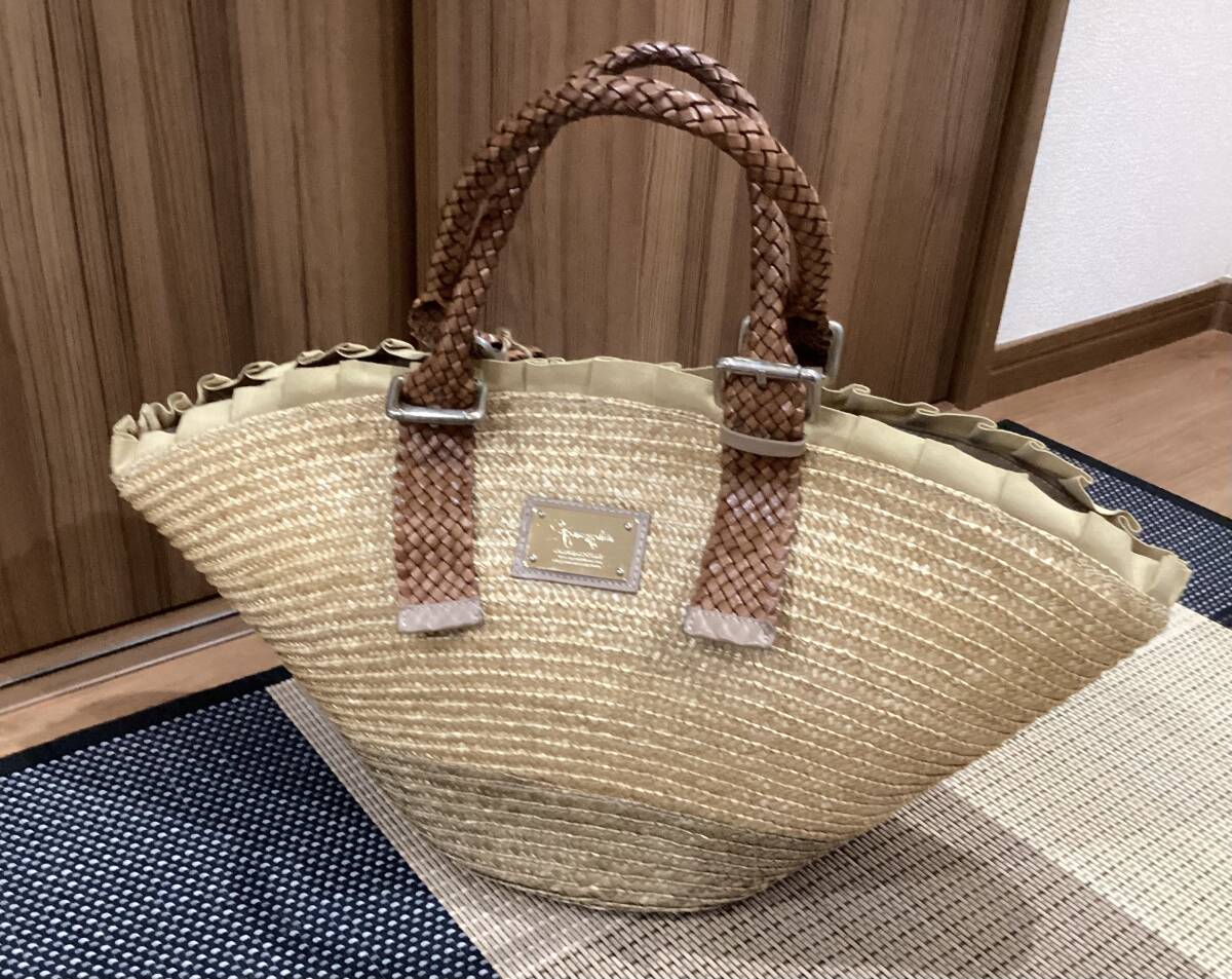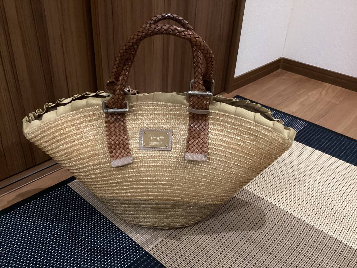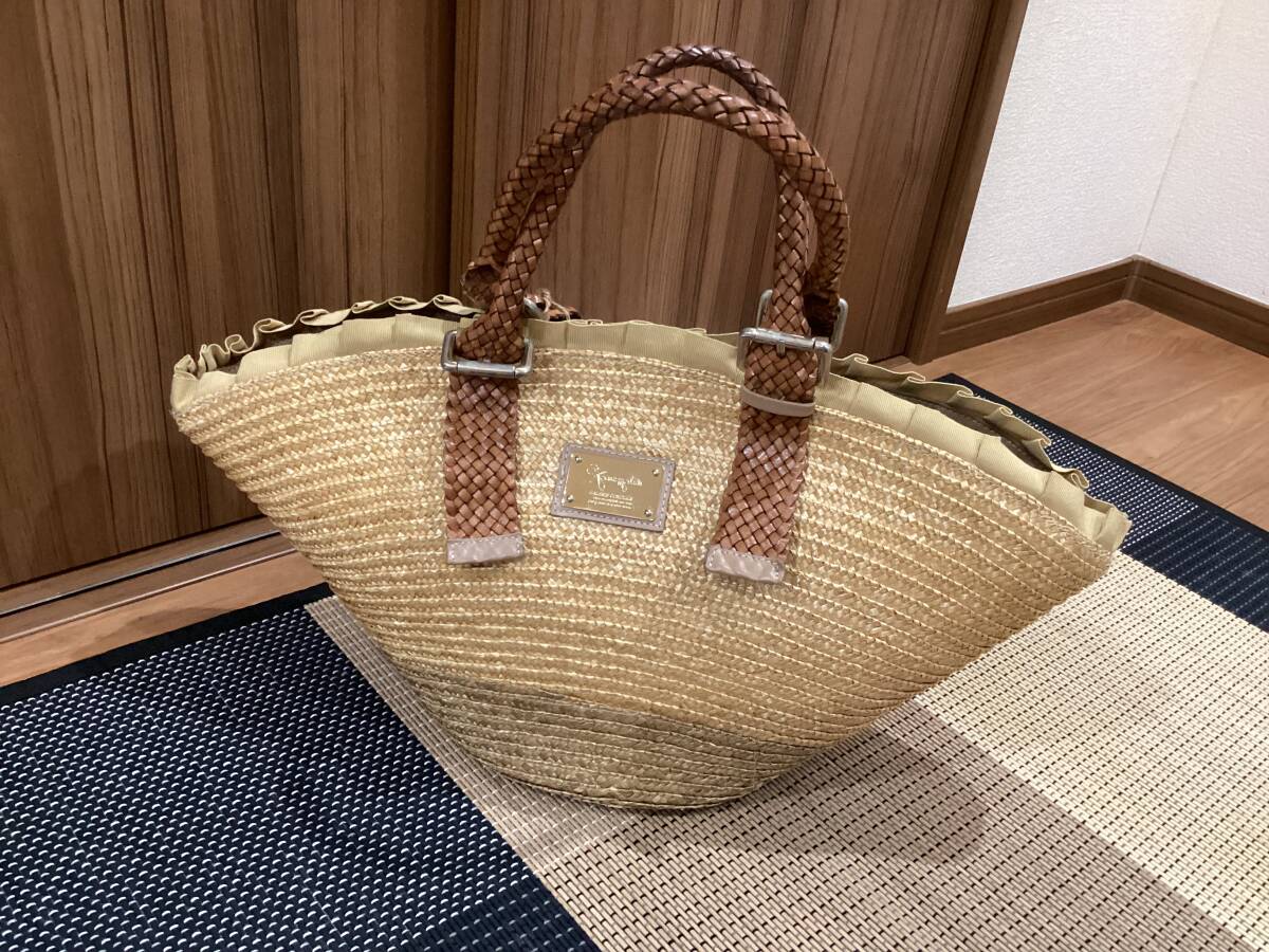 夏素材&持ち手がレザー調、収納力もあります。大きさは開口部で最大50,高さ26cm、マチ底部最大17cmぐらい
