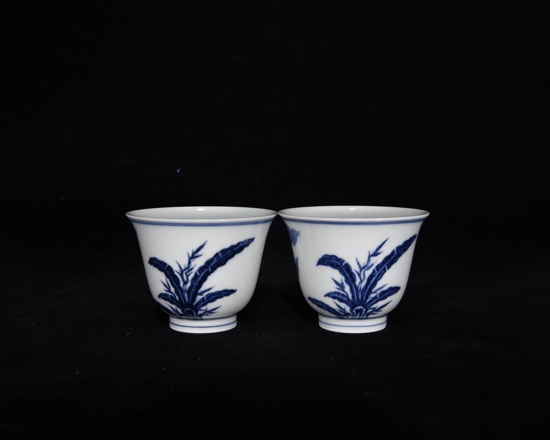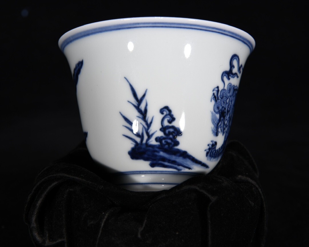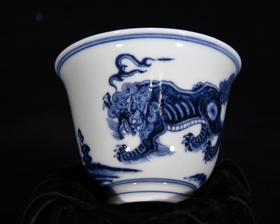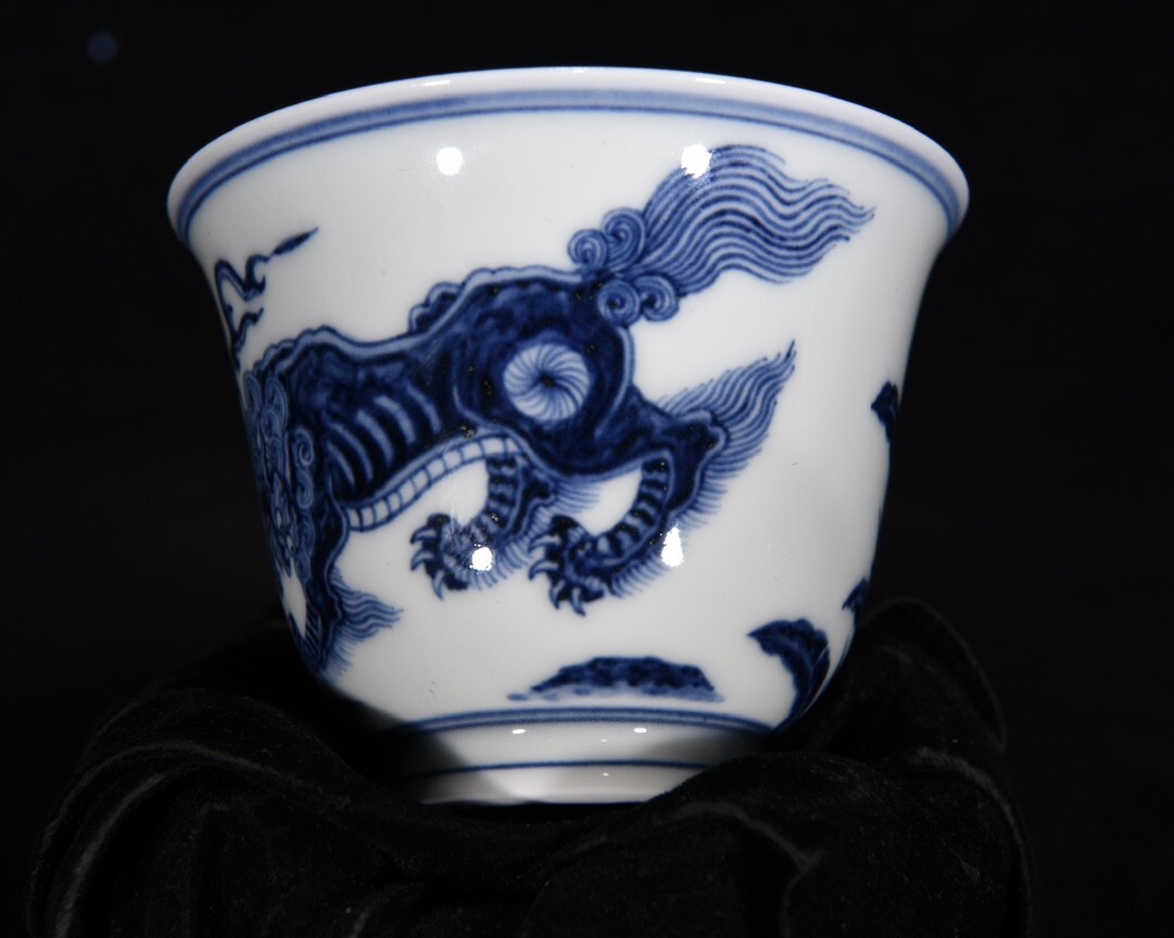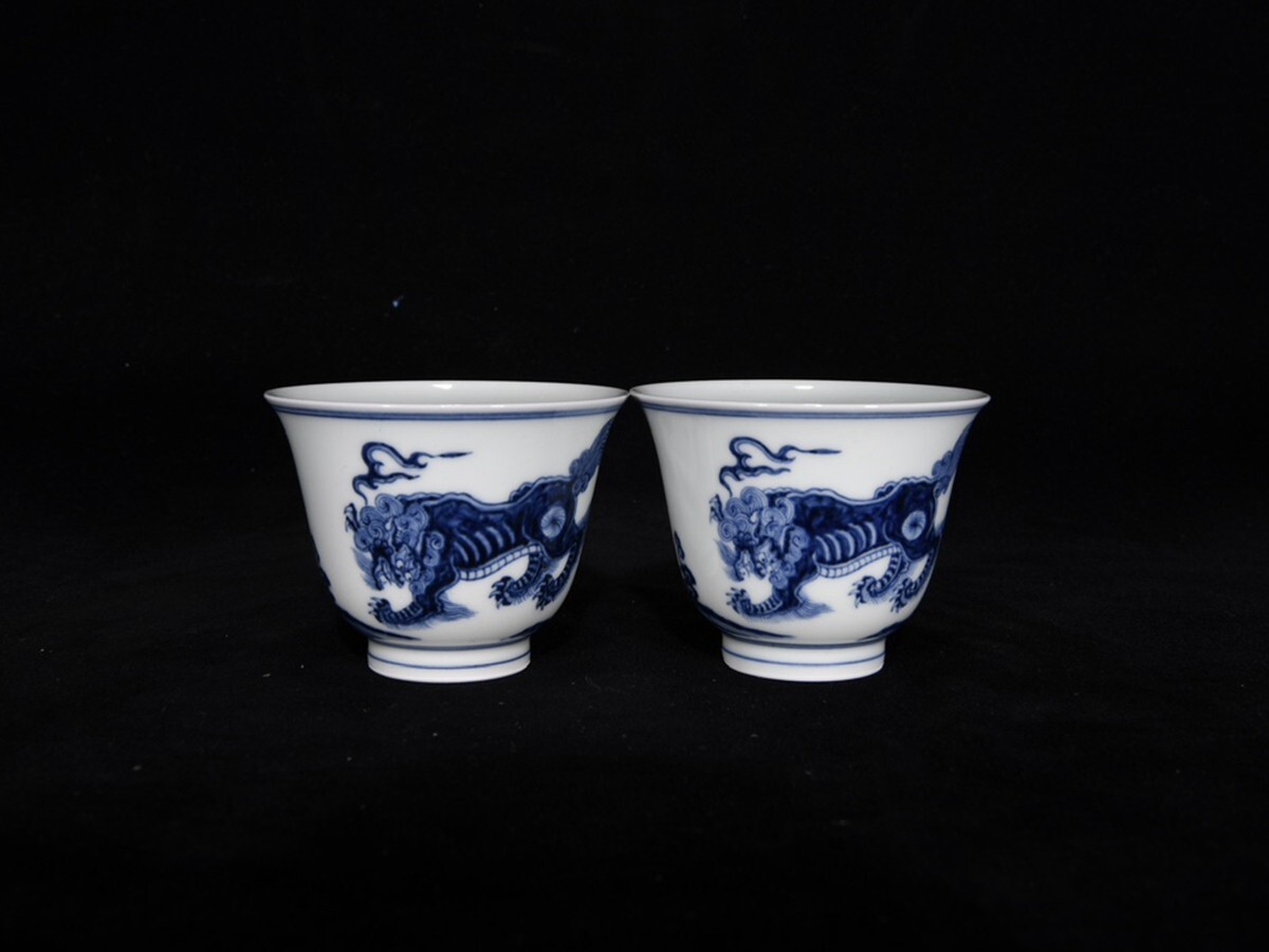 「明 宣徳年製 陶磁器 青花瑞獣紋 杯一対」染付 置物 擺件 古賞物 中国古美術 旧蔵出