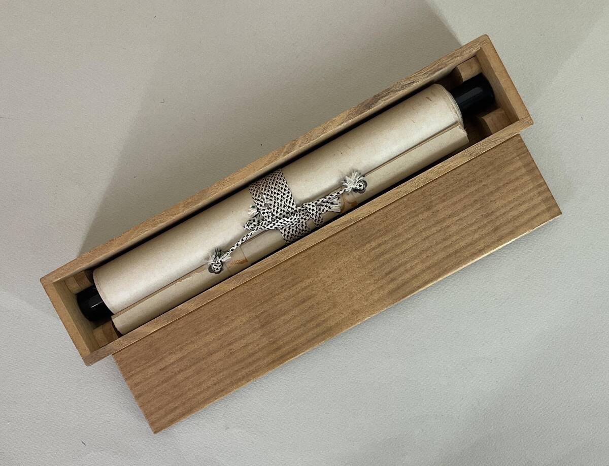古い掛け軸は軸先を固定している接着剤が弱り、輸送途中の衝撃で軸先が外れてしまう場合がございます。
