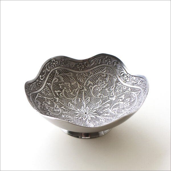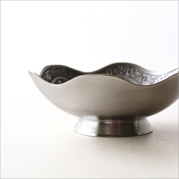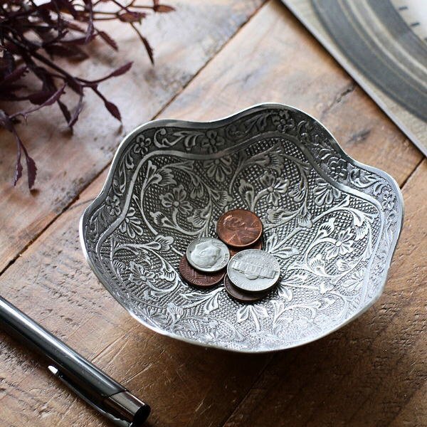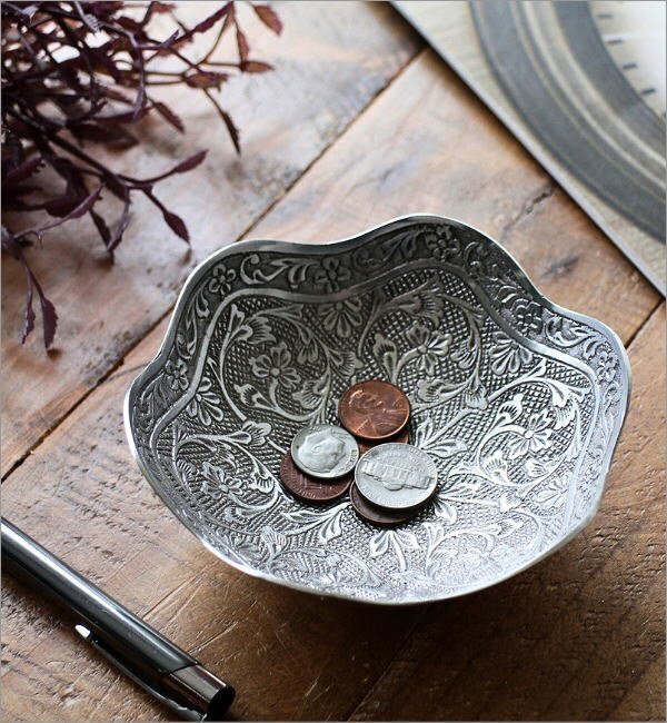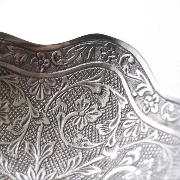 | 使い込まれたような 静かで落ち着いたホワイト真鍮の色合いが 上品でノスタルジックな雰囲気を醸し出す アンティークな雰囲気のプレート プレートの内側には 草花モチーフのレリーフが 隙間なくデザインされており 光の当たり方で表情が変わる 美しい仕上がりで高級感たっぷり アクセサリーや鍵、腕時計などの一時置き場として 玄関先やベッドサイド、デスク周りで活躍 小物入れとして使うのはもちろん 何も置かずにそのまま飾っておくだけでも インテリアの素敵なアクセントになりそうです 商品名 : ブラスフラワートレイ スカラップ 商品番号 : ras2119 全体サイズ(cm) : 直径12.5×高さ4.5 材質 : 真鍮 重量 : 160g 生産国 : インド ※真鍮の特徴である、空気中の成分と反応して起こる色のムラ・黒ずみ(経年変化)が見られます ※手作り品のため、僅かなガタつきや傾き等はご容赦ください ※小傷等のあるアンティーク調の商品です ※ディスプレイによる色の違いはご了承下さい |