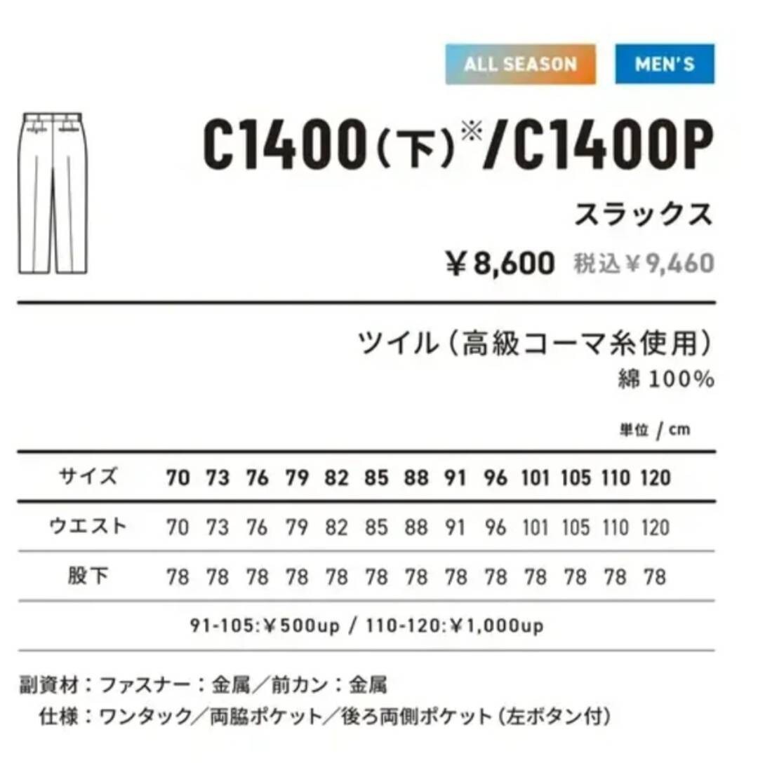 4559 アルトコーポレーション|C-1400 スラックス|グレー|W73㎝×2本|綿100%|通年 春夏 秋冬|新品未使用|帯電防止|ドライ DRY|作業ズボン