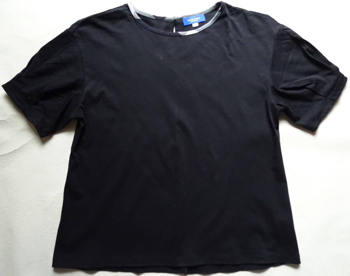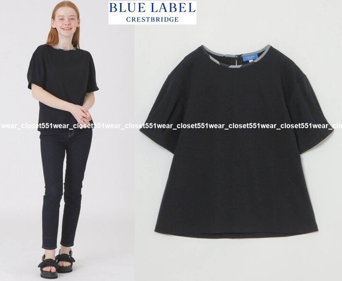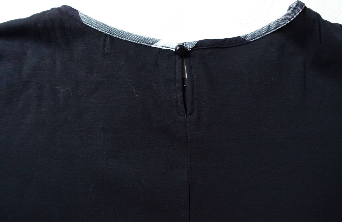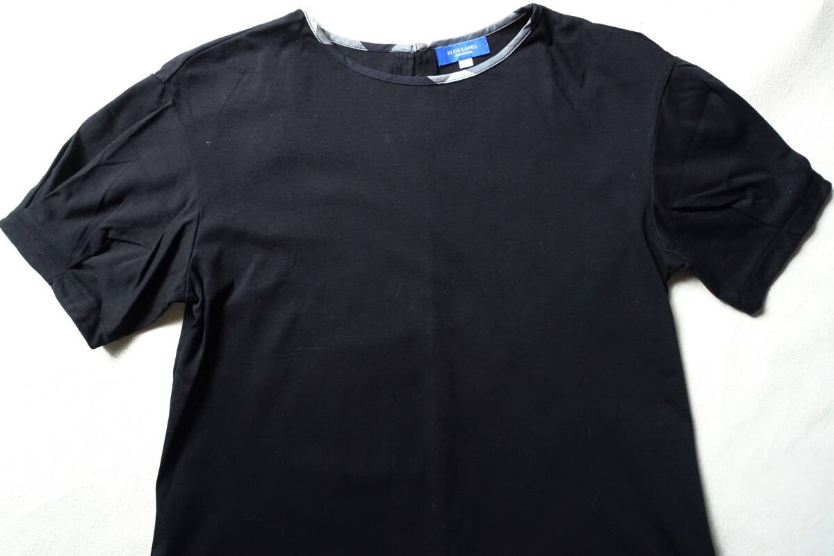 BLUE LABEL CRESTBRIDGEの着回し力抜群なシンプルカットソー。2022S/Sの定価14300円。ドロップショルダーの程よくゆとりがあるサイズ感。タックが入ったスリーブと、クレストブリッジチェック生地でトリミングした衿元がポイント。ハイゲージな編み機で編んでいるスムース素材。シルケット加工を入れることにより生地に布帛ライクなハリコシを実現。裾をインでもアウトでも着用しやすい着丈なので、スカートでもパンツでも、ボトムを選ばず着用頂けます。