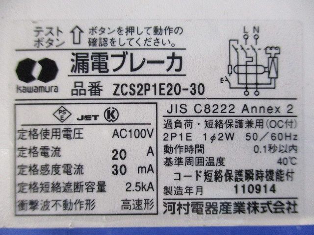 漏電ブレーカ2P1E20A(汚れ有) 河村電器産業 ZCS2P1E20-30