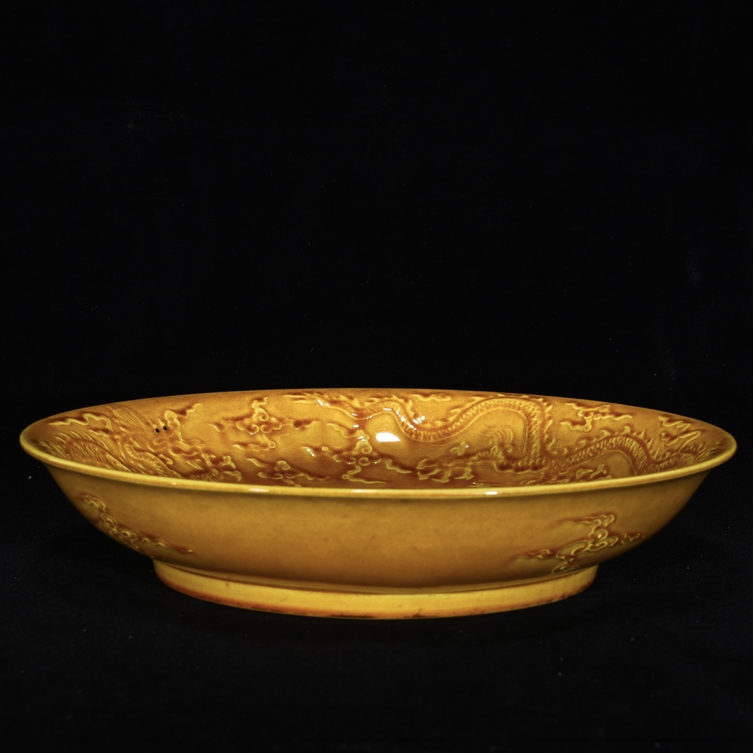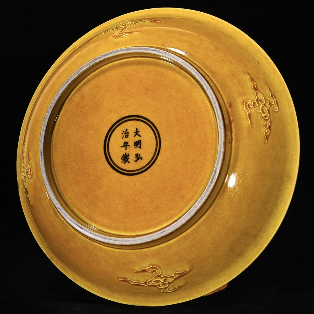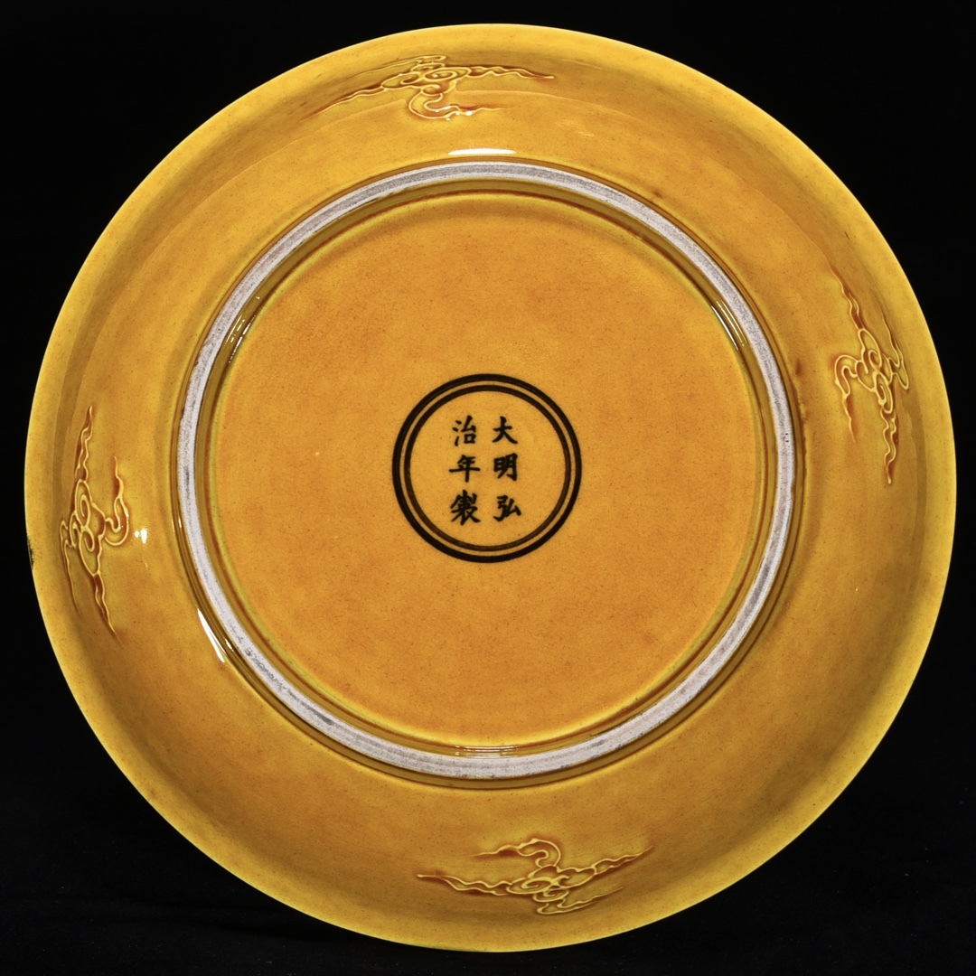 唐物 明 弘治年制 黄釉 刻龍鳳紋皿 陶芸 古陶磁器 中国磁器 古美術品 時代物 中国古玩 骨董品 D67