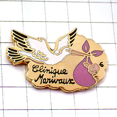 | "ピンバッジ・コウノトリ鳥に運ばれるピンクの袋の中の赤ちゃん"の商品説明 | |