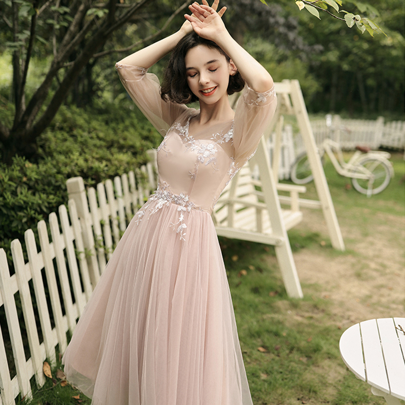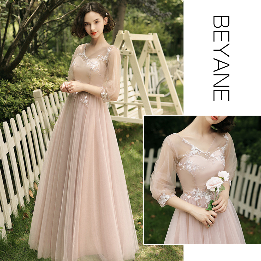 発表会 演奏会 ピンク シアー袖 上品 中学生 高校生 衣装 ドレス ロングドレス 刺繍 花 花柄 チュール 編み上げ リボン 卒業式 成人式