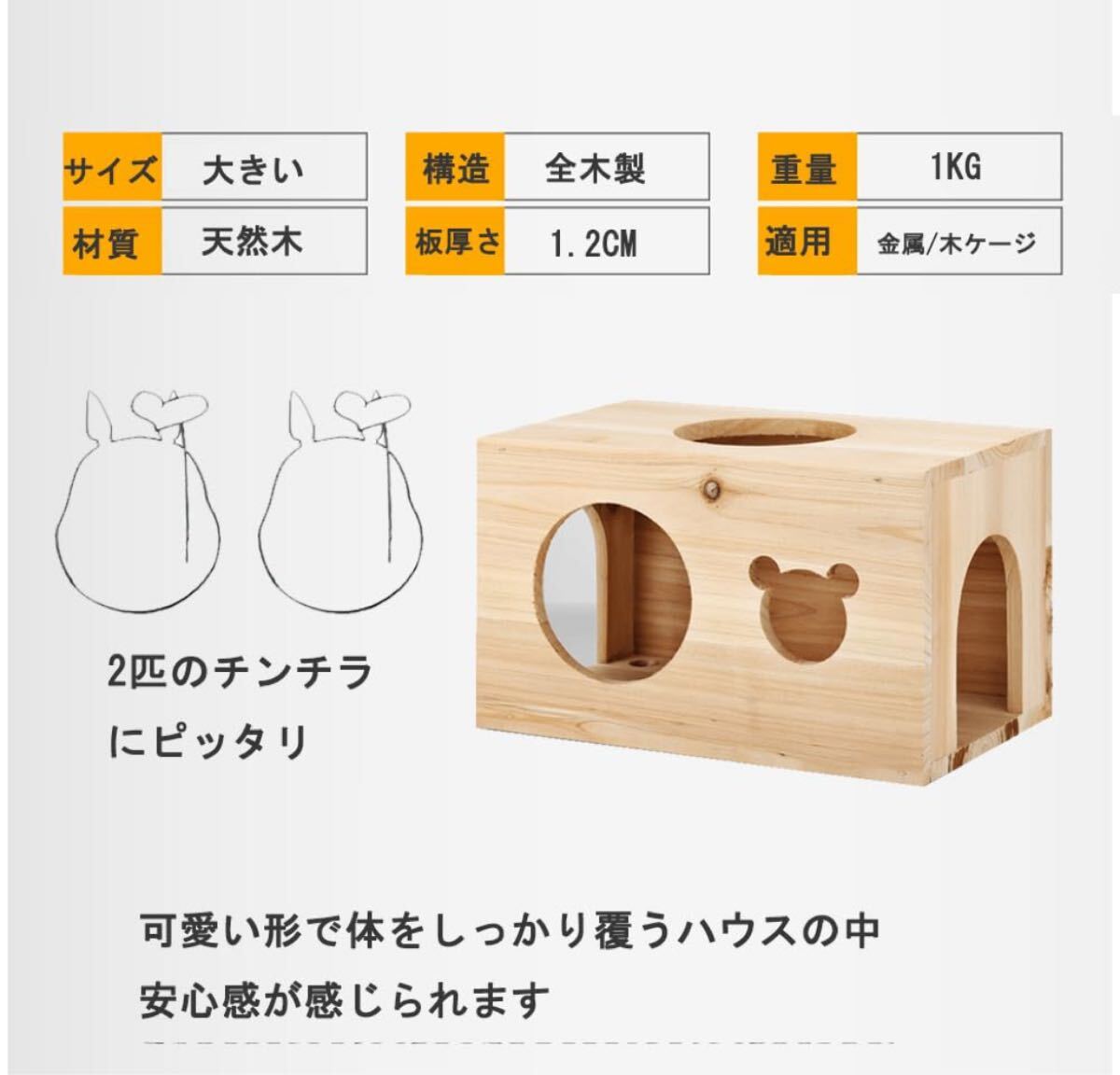 【高い実用性】この木製の家はかなり大きく、チンチラが出入りできる4つの開口部があります。チンチラは上の穴から頭を突き出して周囲を観察することもでき、これをとても楽しんでいます。この家は、2匹のチンチラが一緒に住むのに最適で、また大きいチンチラが赤ちゃんを育てるのにも適しています。
