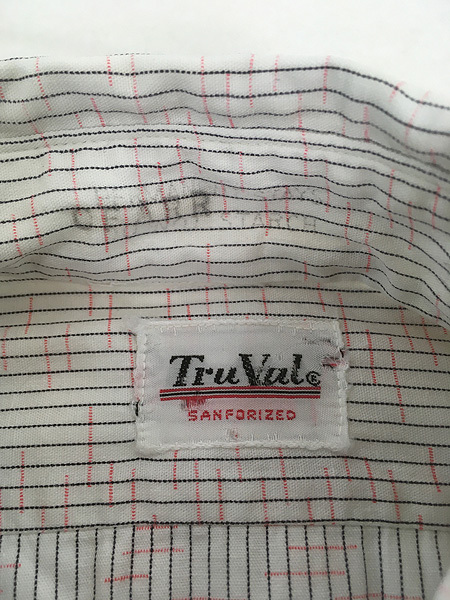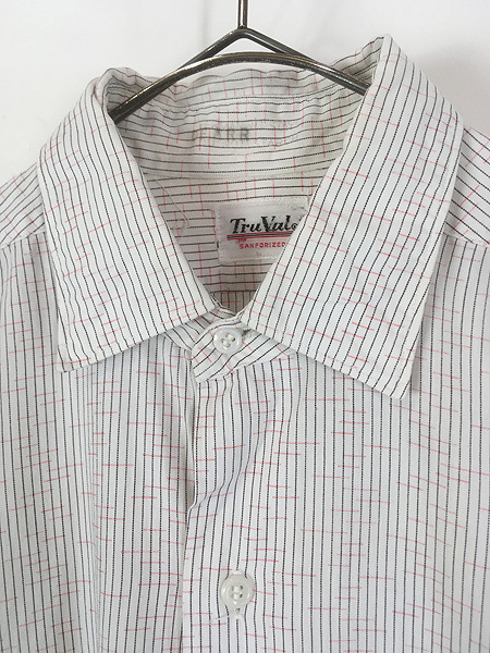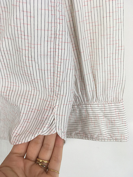 年代特有のハリのあるコットン素材・襟芯入り・サイド巻き縫い・白ボタン・裾脇にマチ。