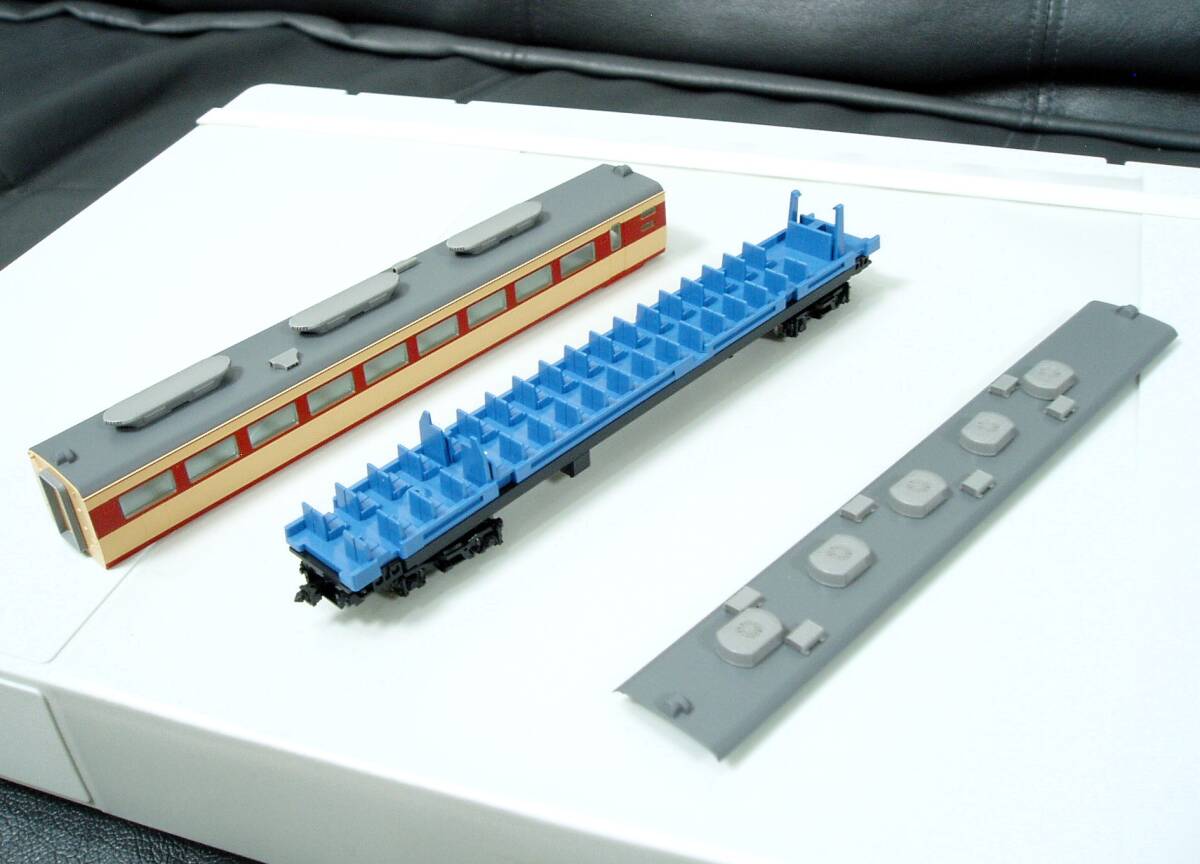 写真はありませんが、トイレタンクやクハ用のスノープロウ、ホイッスルパーツ、屋根上に取り付ける列車アンテナやサロ用ラジオアンテナなどのパーツは、必要分付属します。また万が一不足していた場合は、恐れ入りますがご落札者様にて補充、確保をお願いいたします。