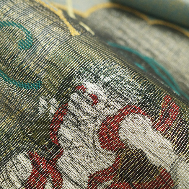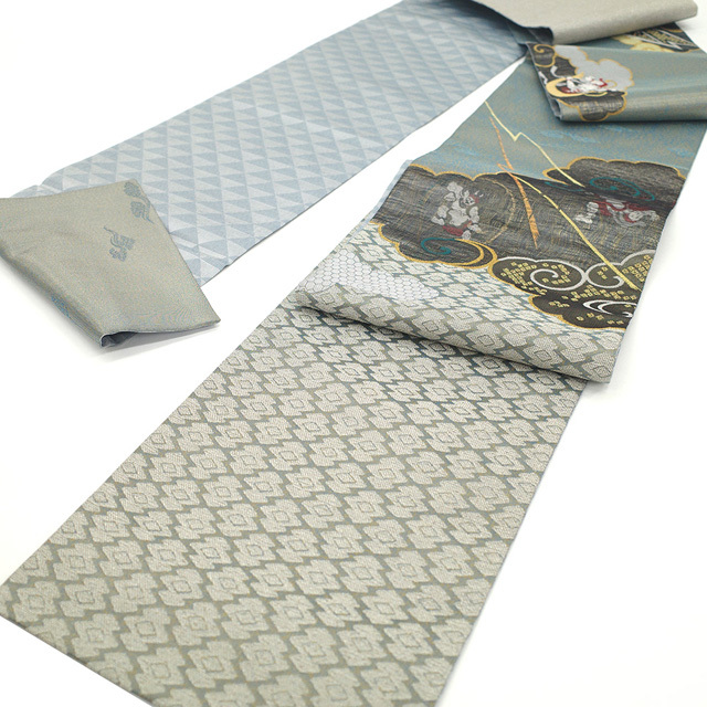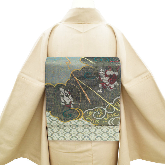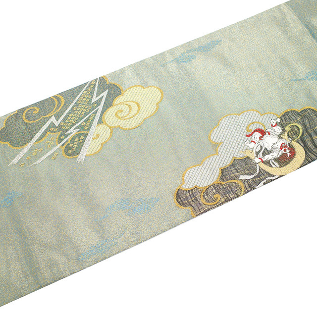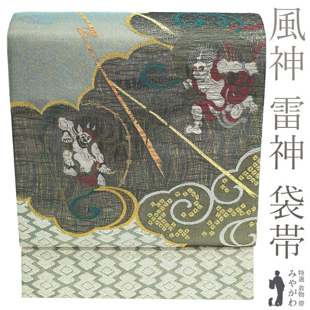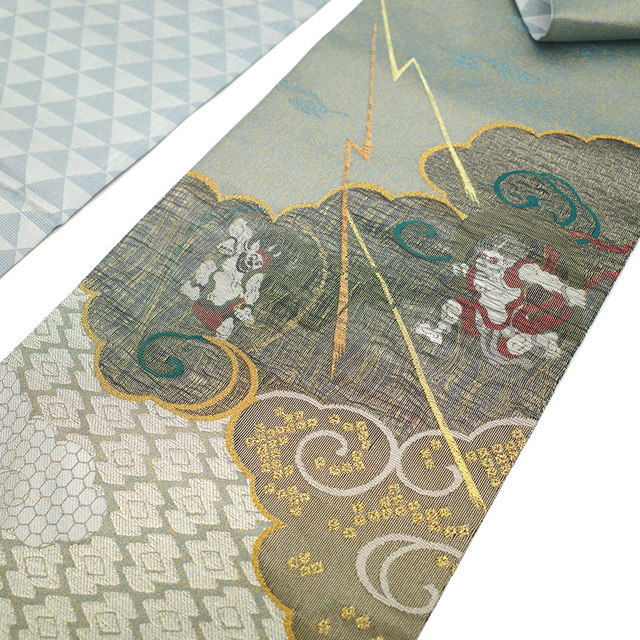 風神雷神が織り出された、インパクトのある柄行のこちらのお品。