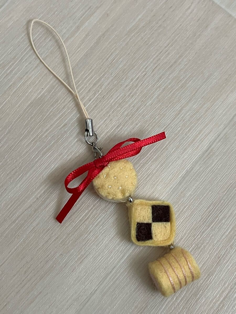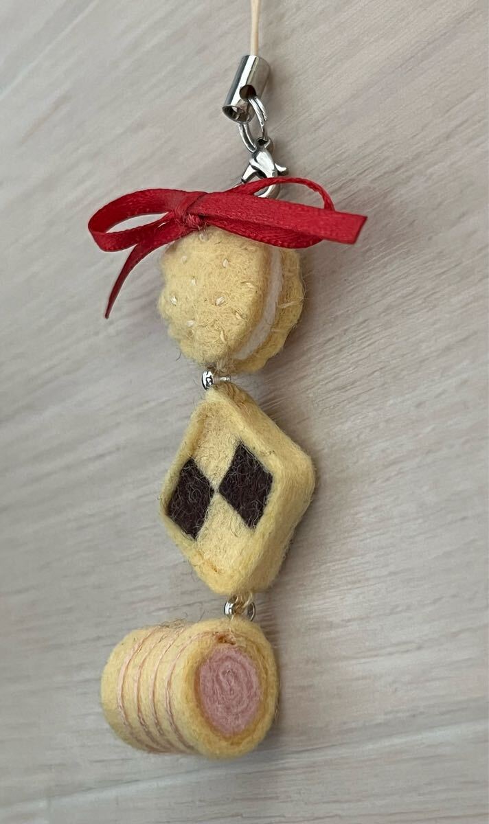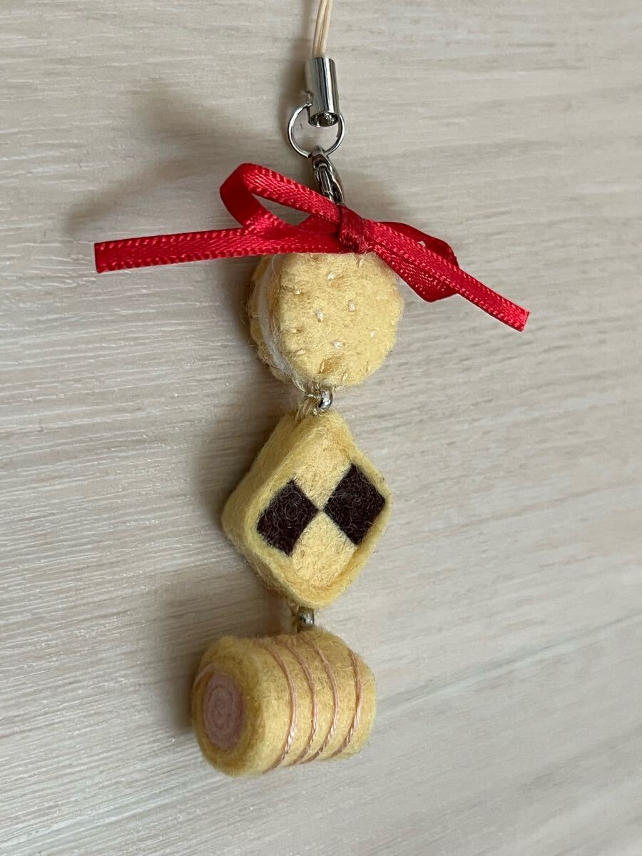 フェルト製の可愛いクッキーとロールケーキのストラップ、赤いリボン付きです。
