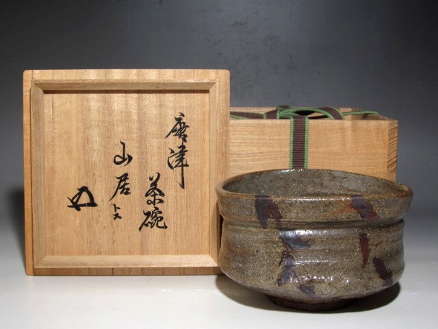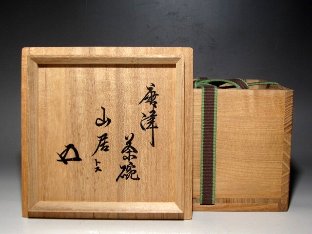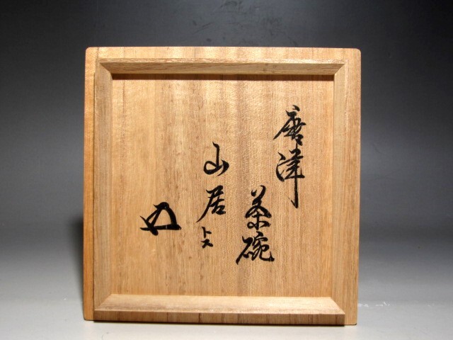 古唐津茶碗「山居」です。 時代を感じる大変見事な逸品です。 箱蓋裏に裏千家十五世鵬雲斎の花押があります。 サイズ 直径13cm/高さ8cm(多少の誤差はお許しください) 状態 一見して疵やヒビ・直しは見られません。 骨董品という事をご勘案頂き、時代経過のスレや、小さな傷がある場合があるかもしれませんのでご承知置きください。 | |||