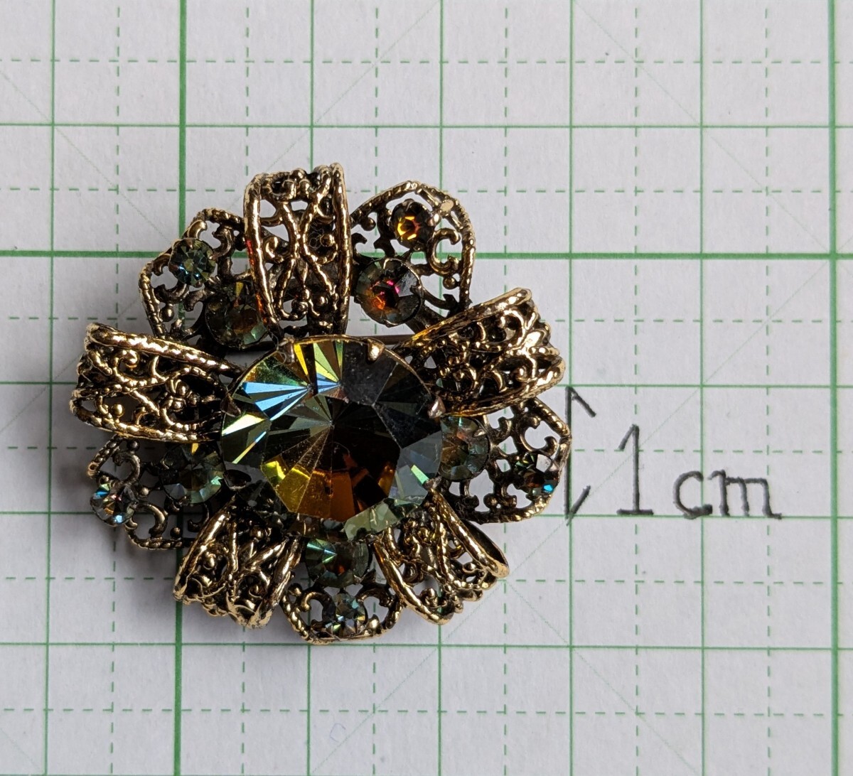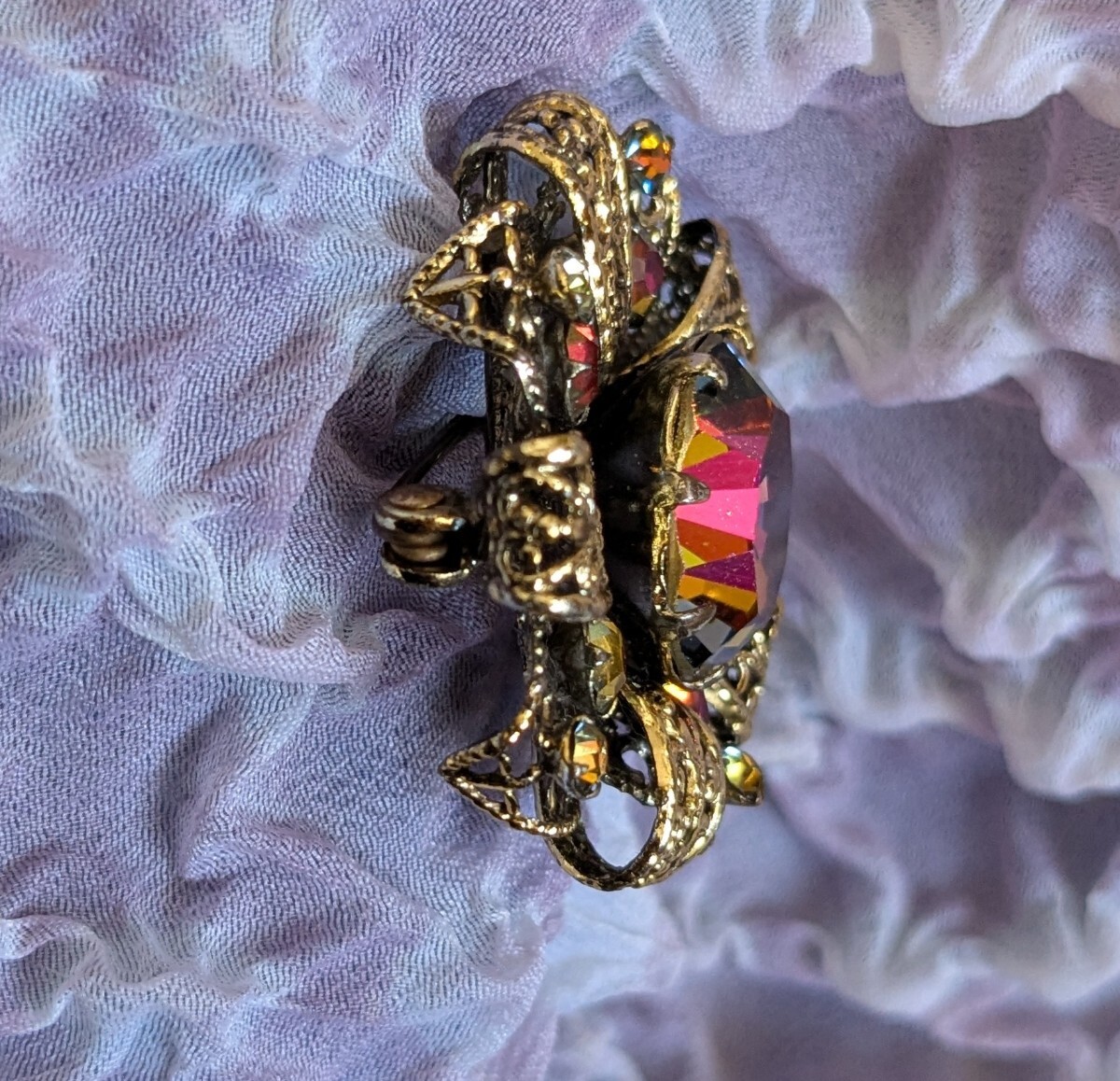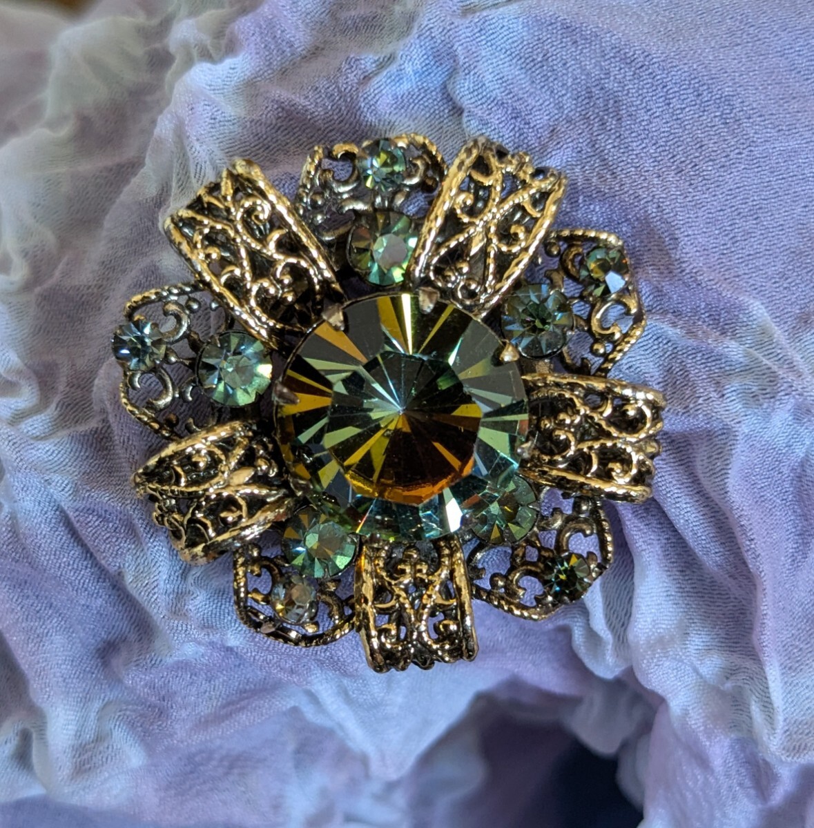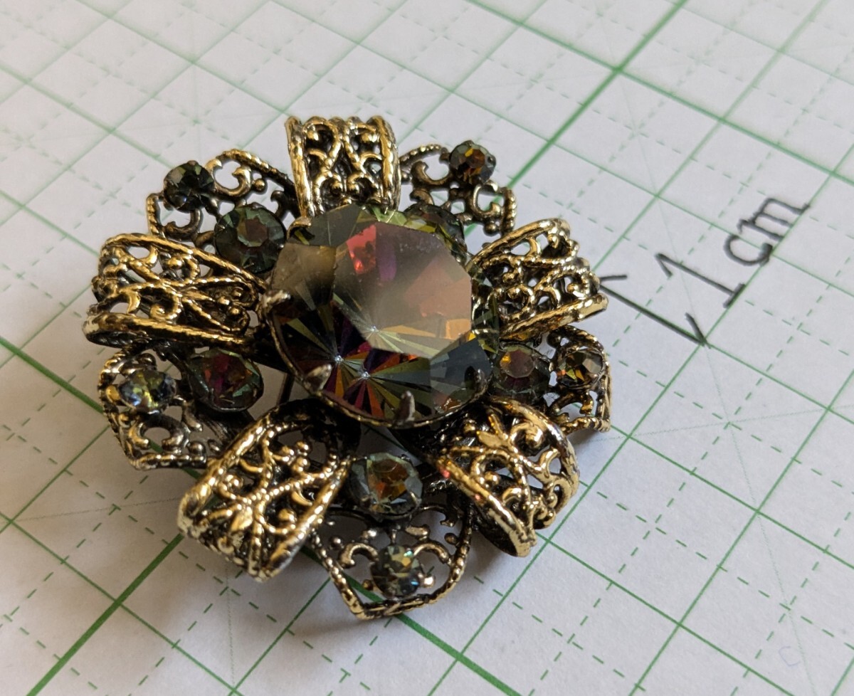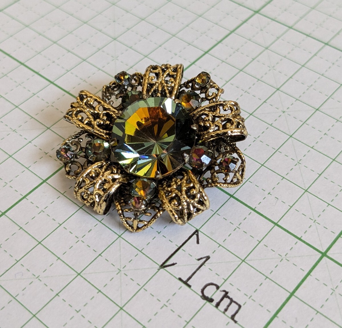 青緑色のガラスが見る角度によってピンク、オレンジ、小豆色など様々に輝くラインストーンのブローチ。