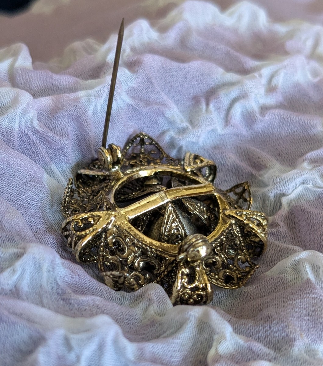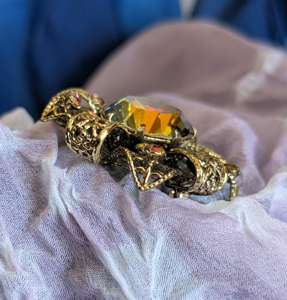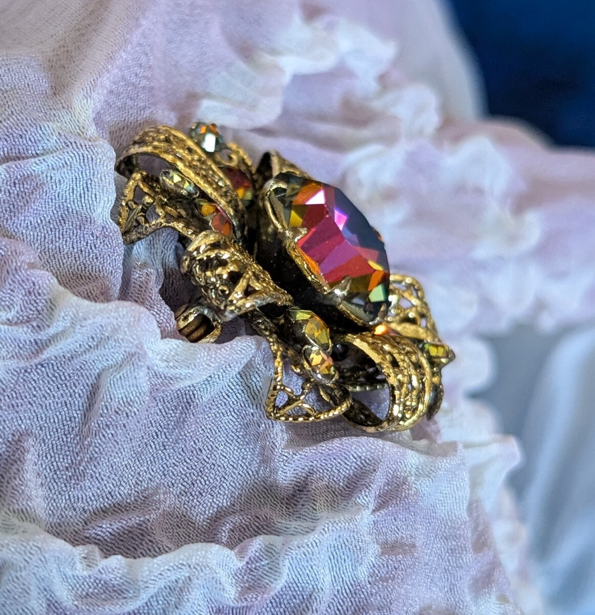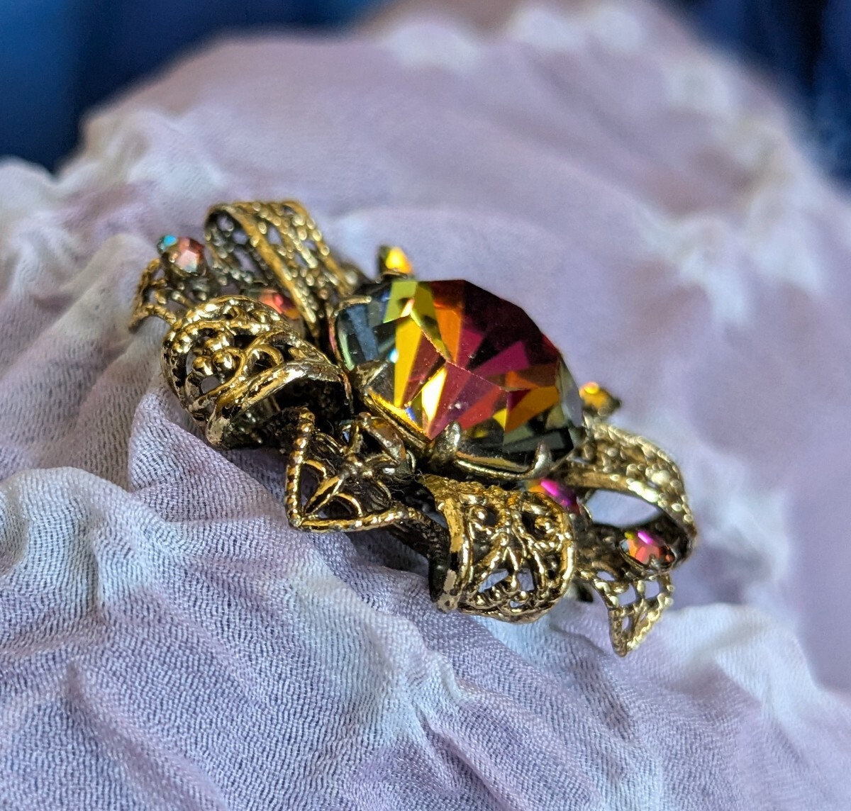 青緑色のガラスが見る角度によってピンク、オレンジ、小豆色など様々に輝くラインストーンのブローチ。