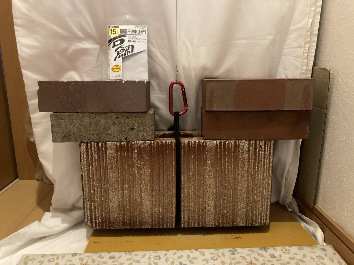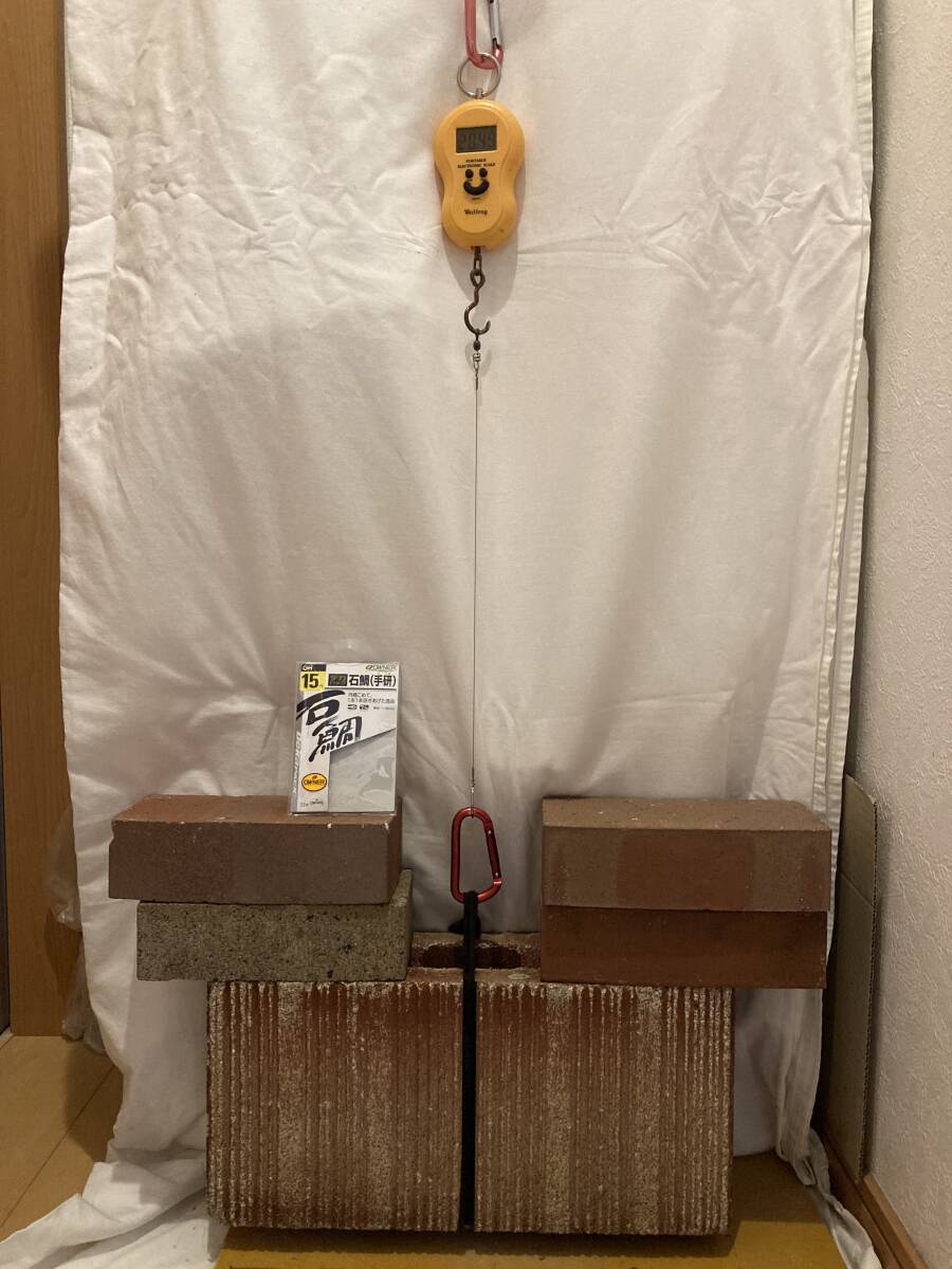 20kg強度耐久テスト実施(画像6.7.8.9.10.)、ブロック10kg+レンガ4個10kg= 20kg