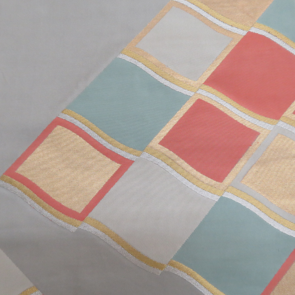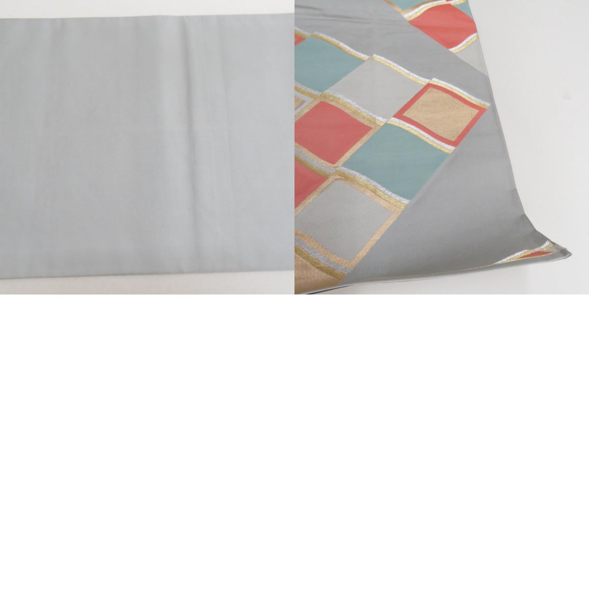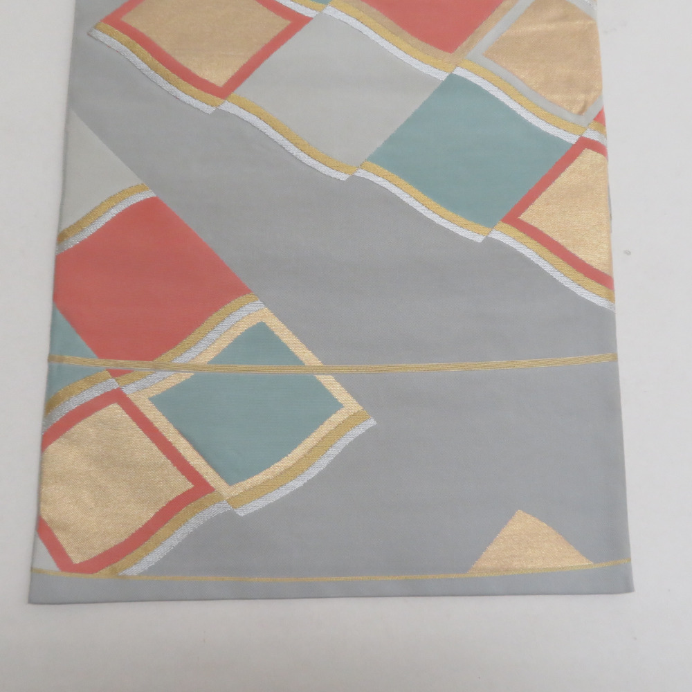 | 袋帯 振袖用 グレーx多色 金糸銀糸 幾何学模様 六通柄 正絹 仕立て上がり 長さ448cm |