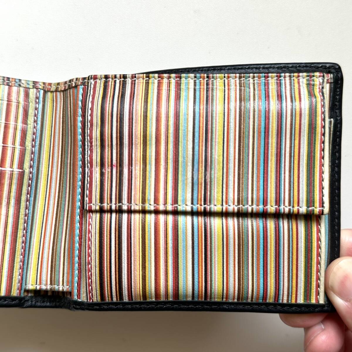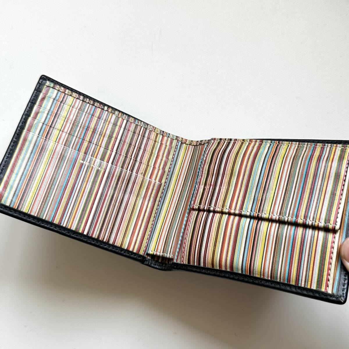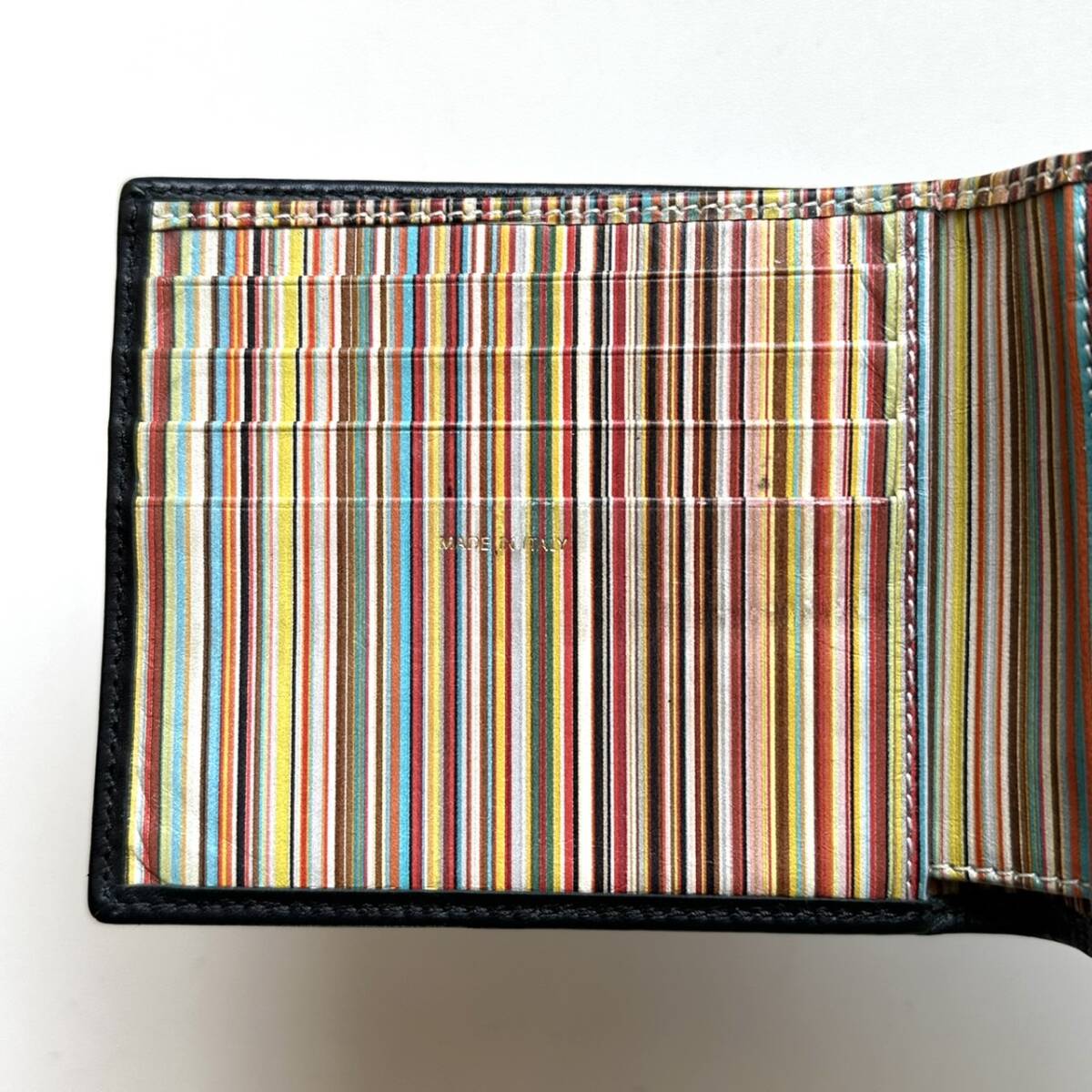商品説明 | ご覧いただき誠にありがとうございます。 ポールスミス Paul Smith 二つ折り財布 マルチストライプ になります。 色は外側がブラック、内側はマルチストライプです。 外側は綺麗です。 内側のマルチストライプの模様には汚れや色スレがあります。 【仕様】 縦9cm、横11cm、厚さ2.3cm、小銭入れ、お札入れ、カード入れ×4、フリーポケット×2 |