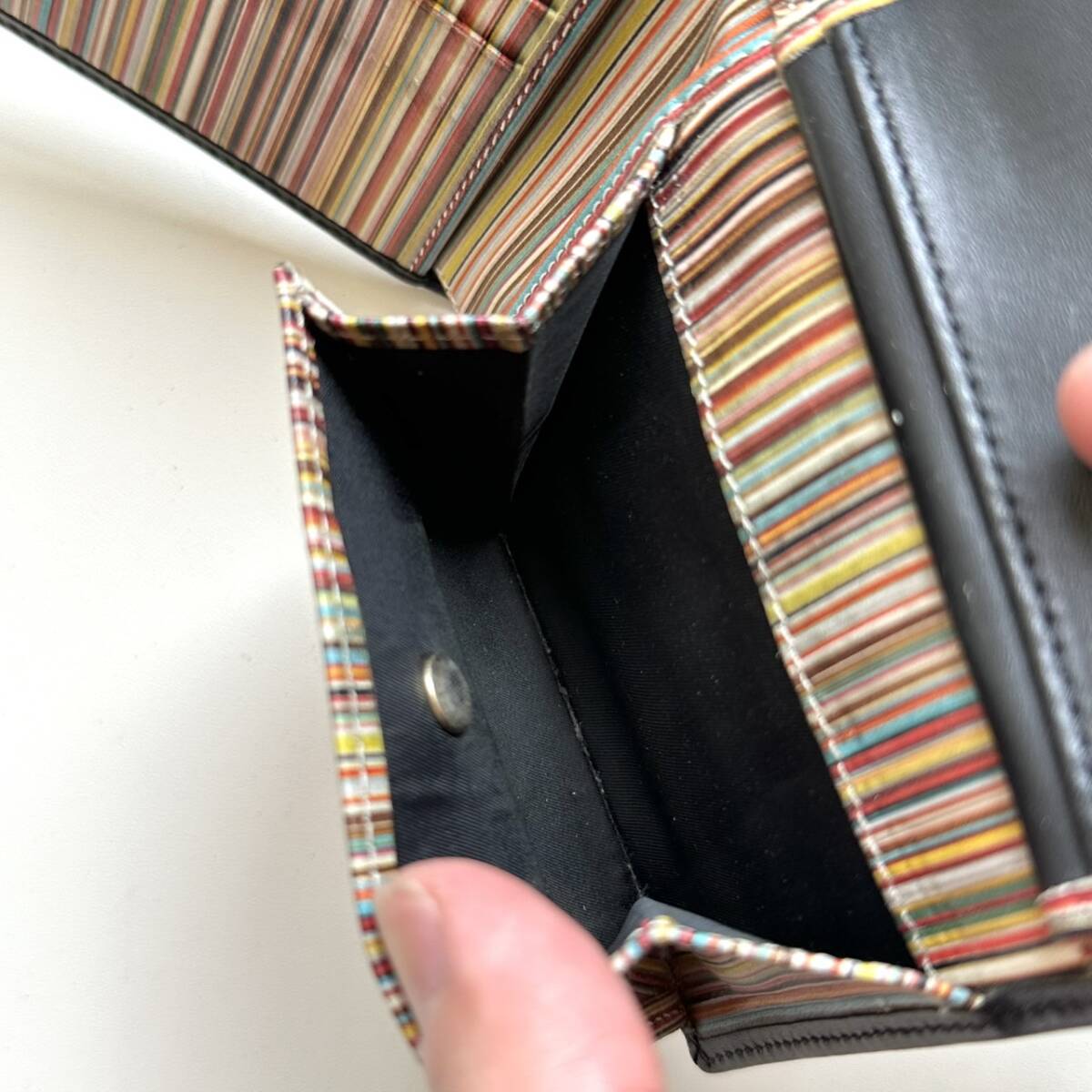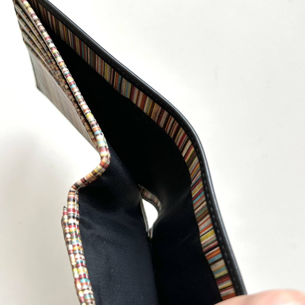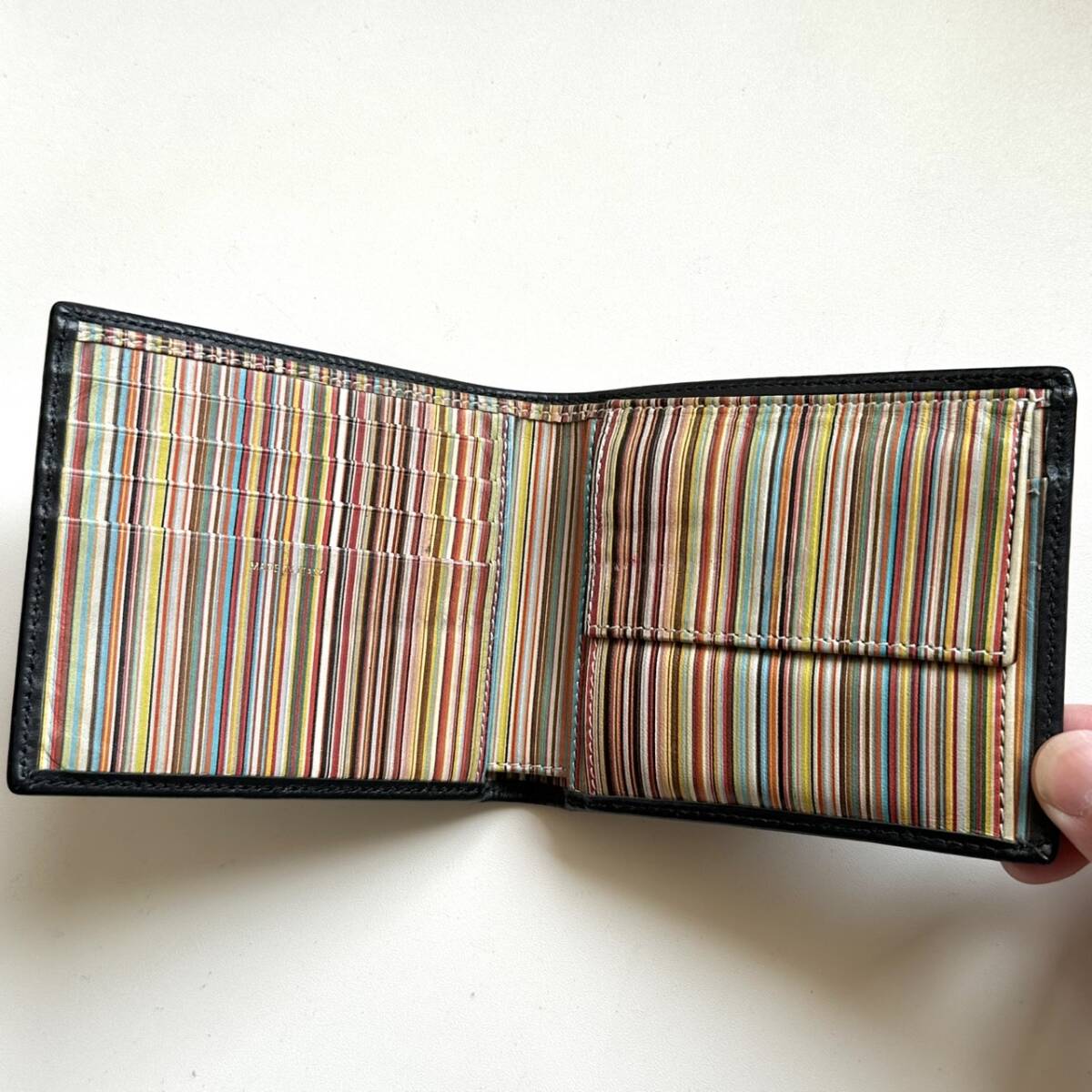 商品説明 | ご覧いただき誠にありがとうございます。 ポールスミス Paul Smith 二つ折り財布 マルチストライプ になります。 色は外側がブラック、内側はマルチストライプです。 外側は綺麗です。 内側のマルチストライプの模様には汚れや色スレがあります。 【仕様】 縦9cm、横11cm、厚さ2.3cm、小銭入れ、お札入れ、カード入れ×4、フリーポケット×2 |