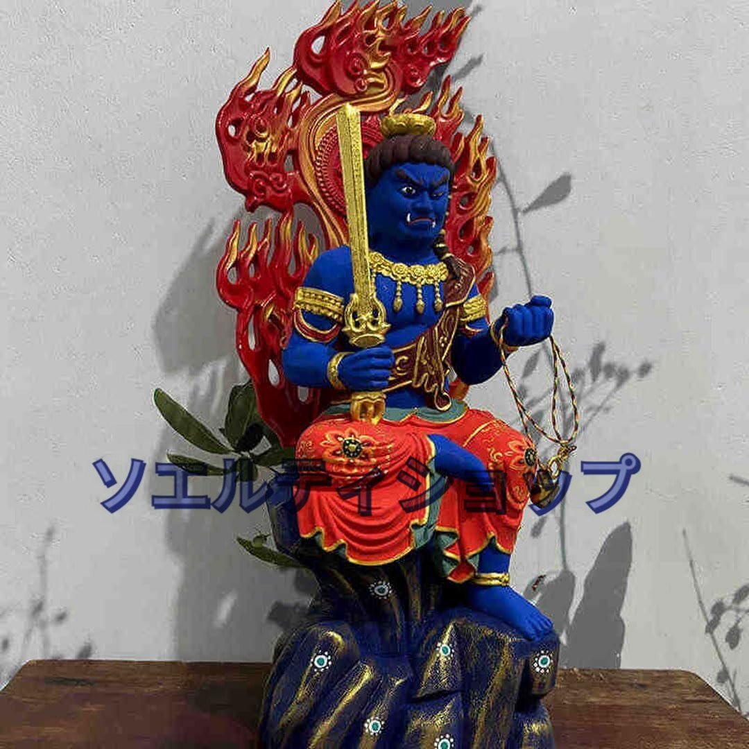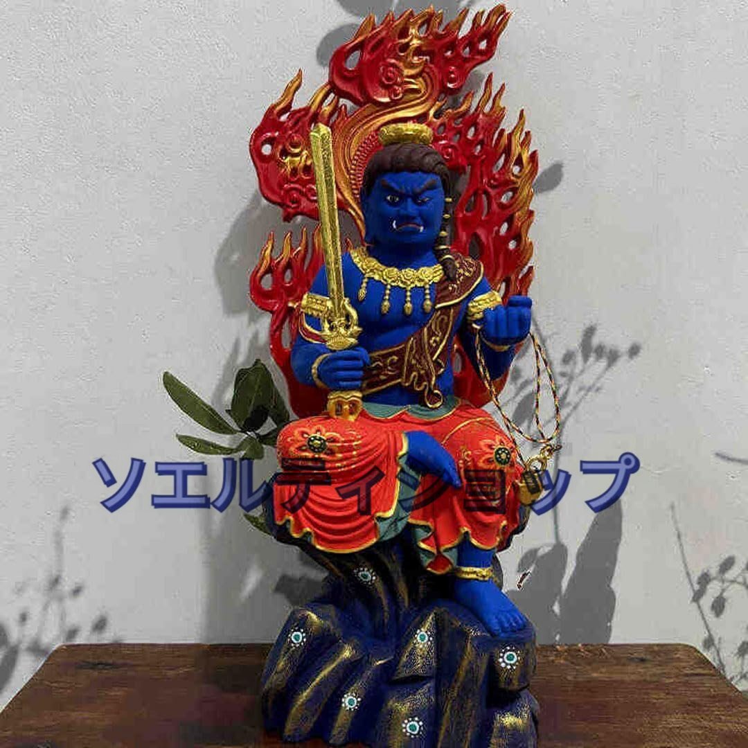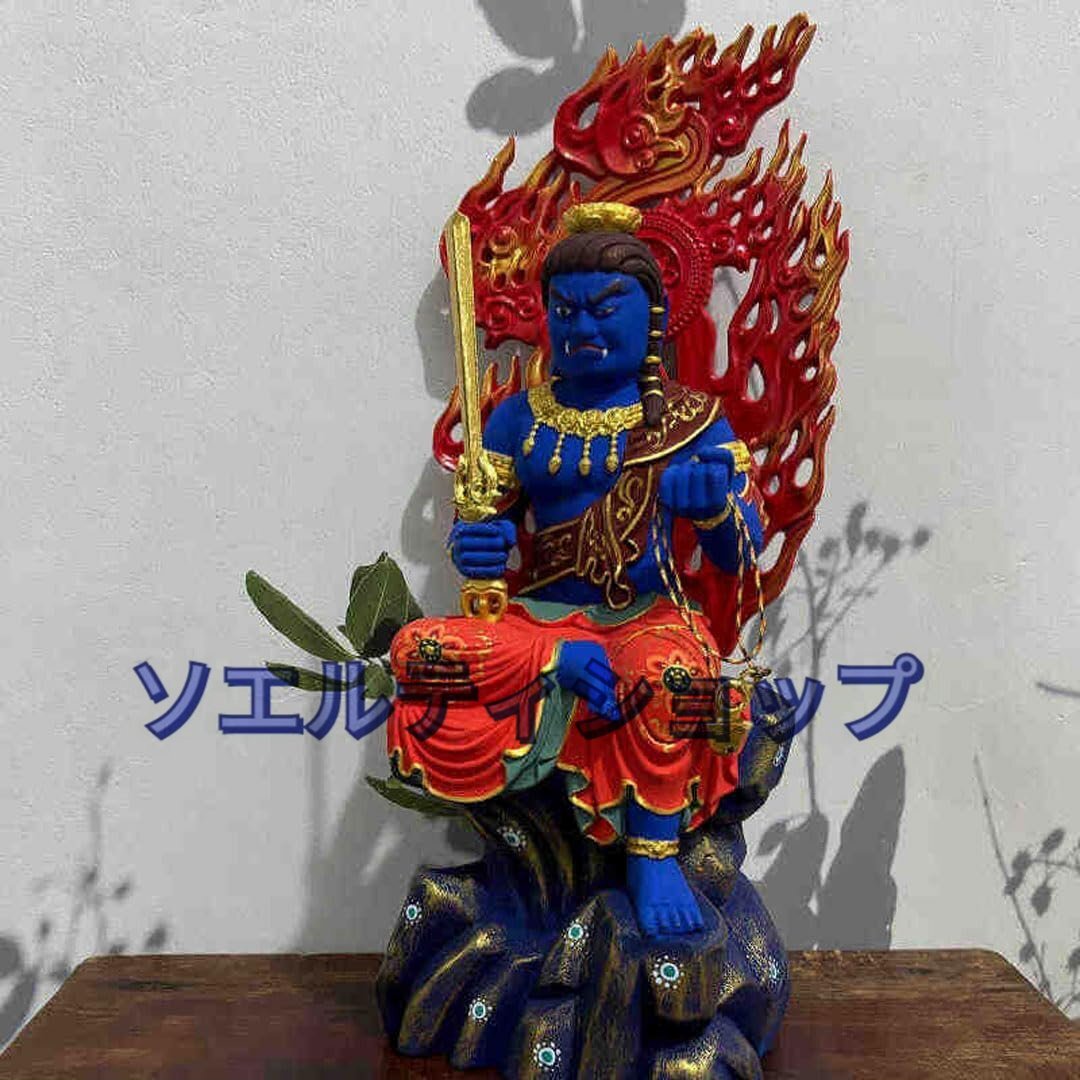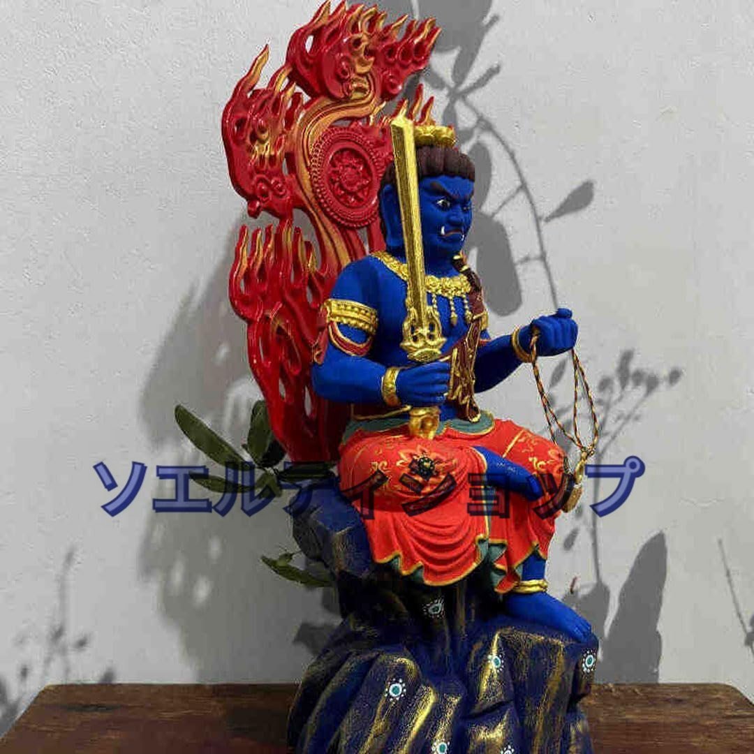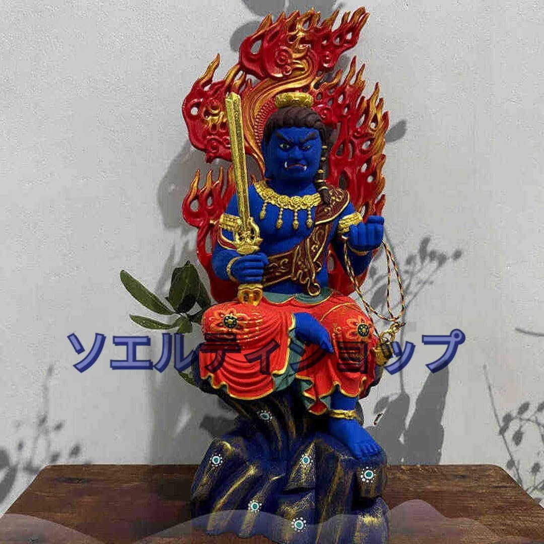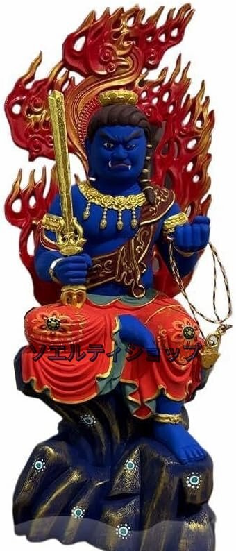 【不動明王】仏像 不動尊 半跏像 木彫り仏像 干支お守り本尊-酉年 桧木彩色(ヒノキ) 木製 火焔光背(17cm)