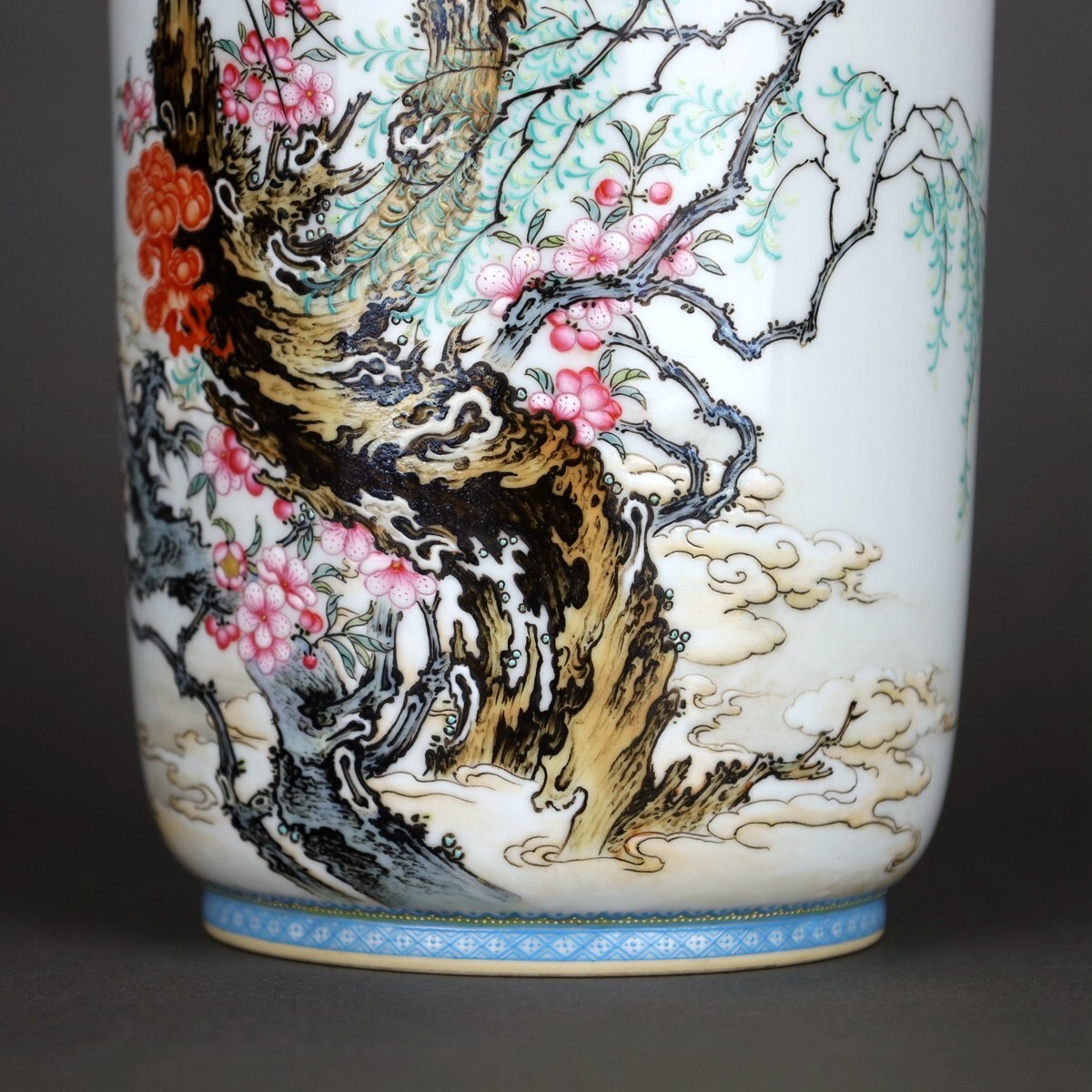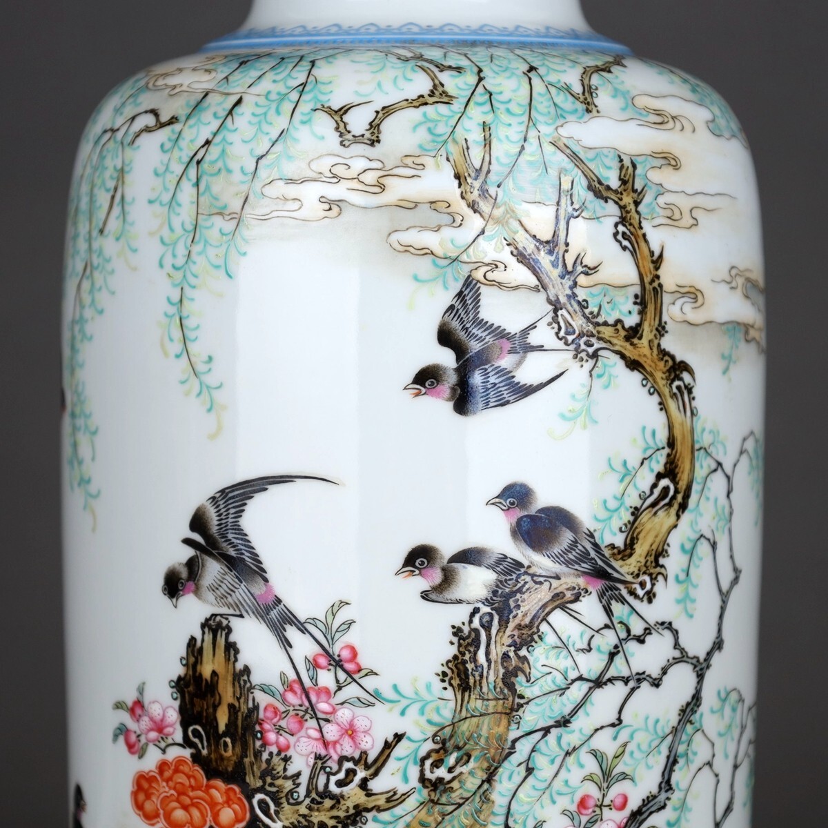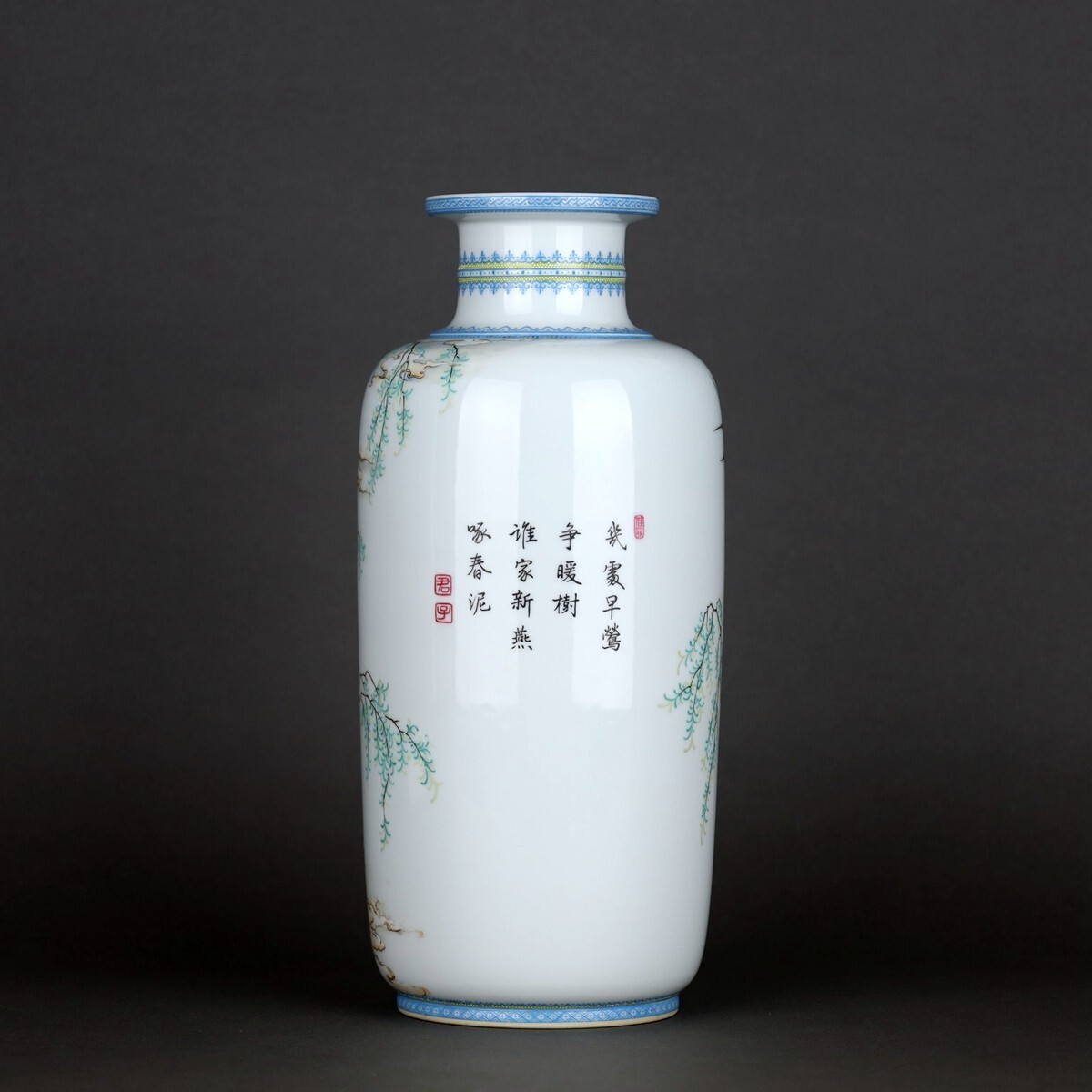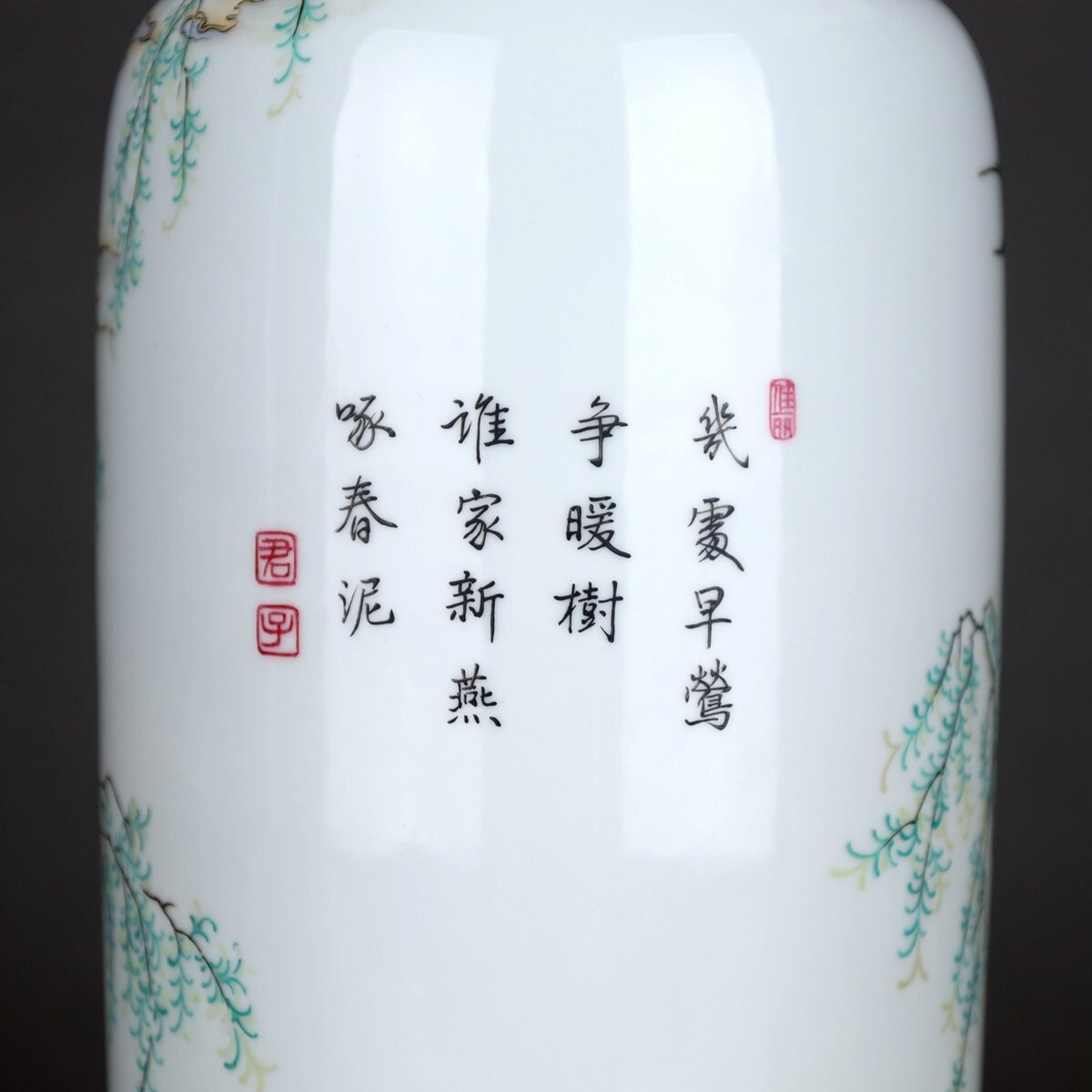 「清 雍正年製 陶磁器 琺瑯彩花鳥詩文図 棒縋瓶」染付 置物 擺件 古賞物 中国古美術 旧蔵出